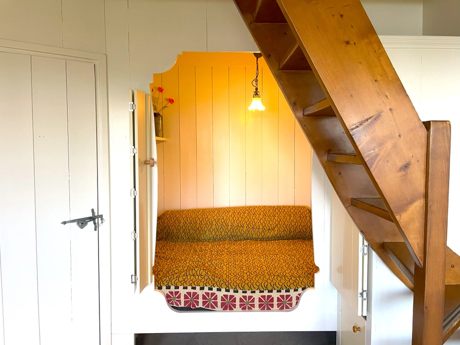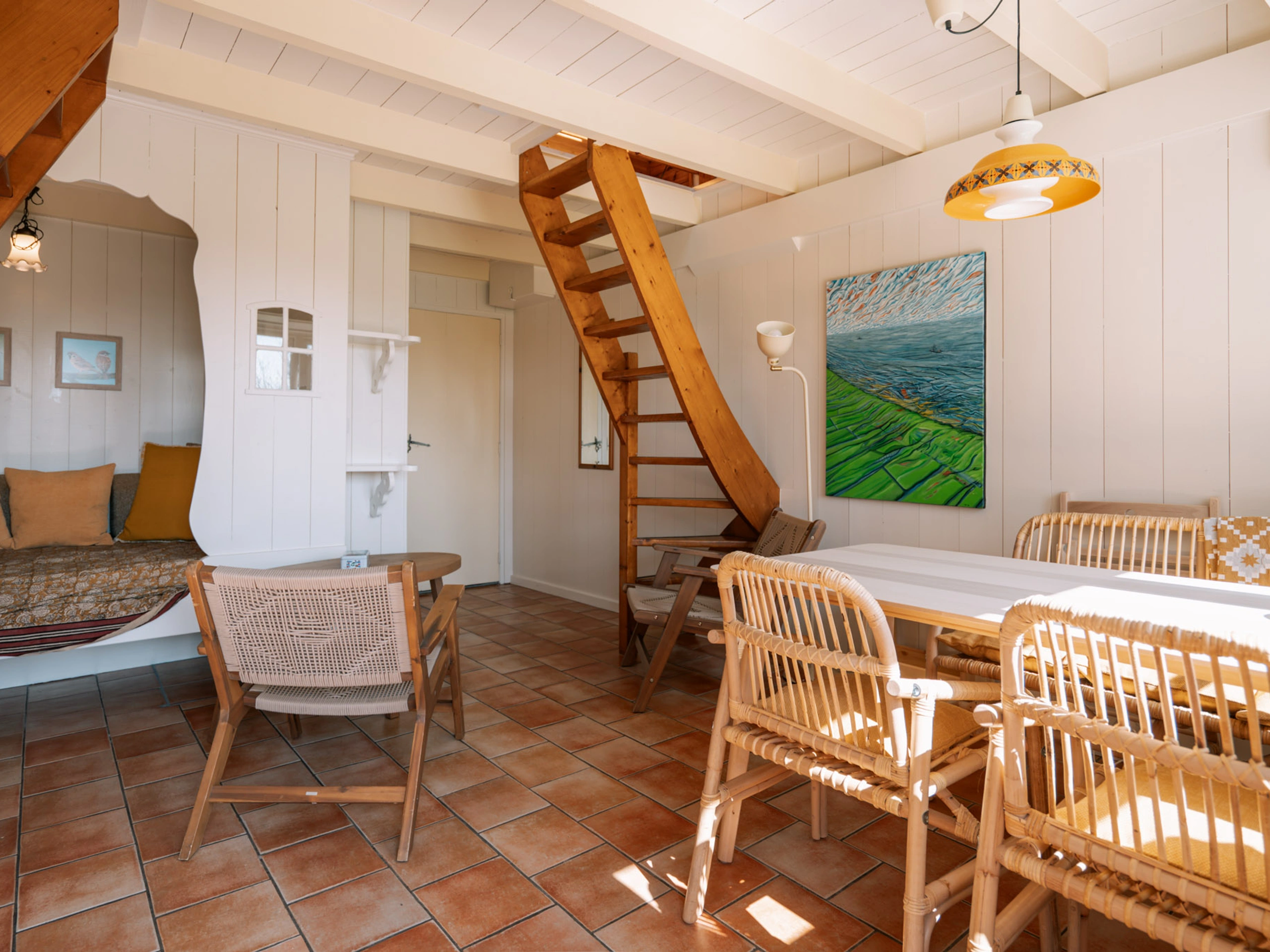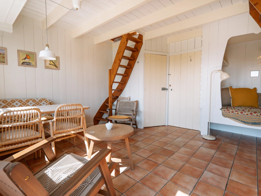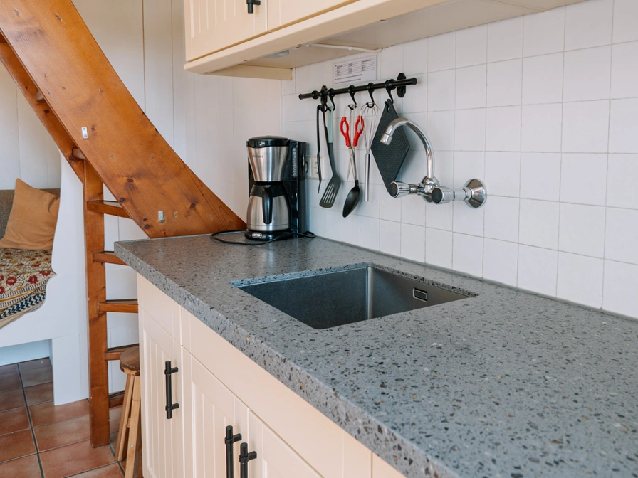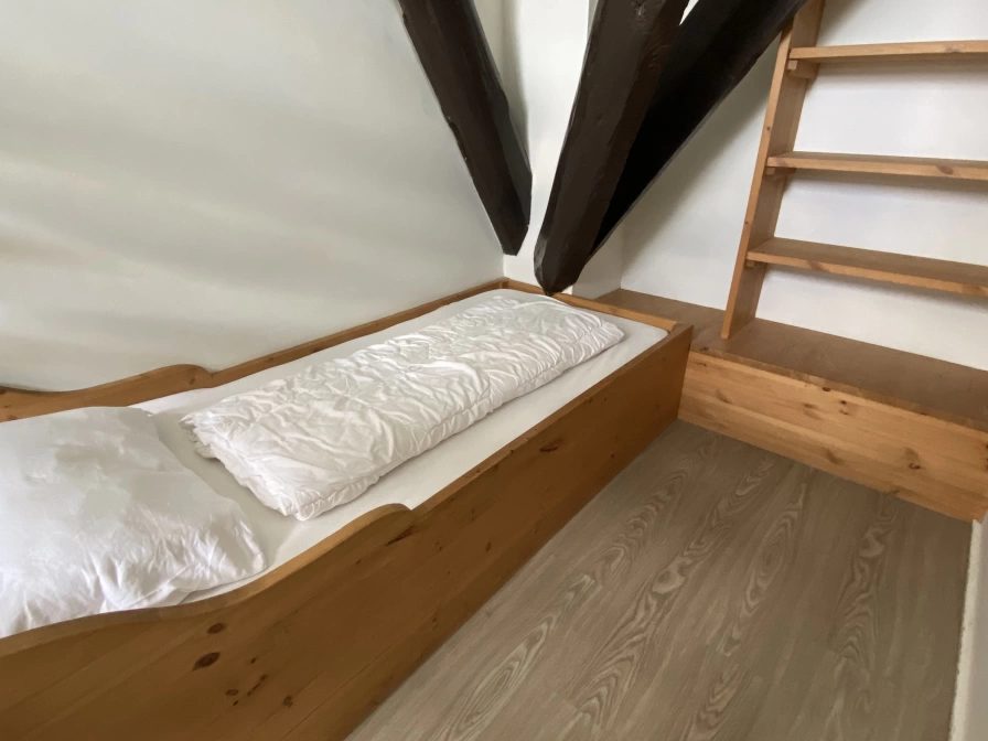 Die Dreizimmerwohnung liegt auf der Südseite des Hofes und hat einen herrlichen Blick über die Wiese und das Wasser. Im Erdgeschoss finden Sie einen Sitz- und Essbereich und eine gut ausgestattete Küche. Hier befindet sich auch ein Badezimmer mit Dusche und WC. Im Obergeschoss befinden sich zwei Schlafzimmer, eines davon mit einem Doppelbett und einem Hochbett und das andere Schlafzimmer mit drei Einzelbetten, darunter 1 Hochbett. Beide Schlafzimmer sind über eine eigene Wendeltreppe erreichbar! Draußen auf der Terrasse finden Sie einen gemütlichen Sitzplatz, wo Sie die Aussicht in vollen Zügen genießen können.