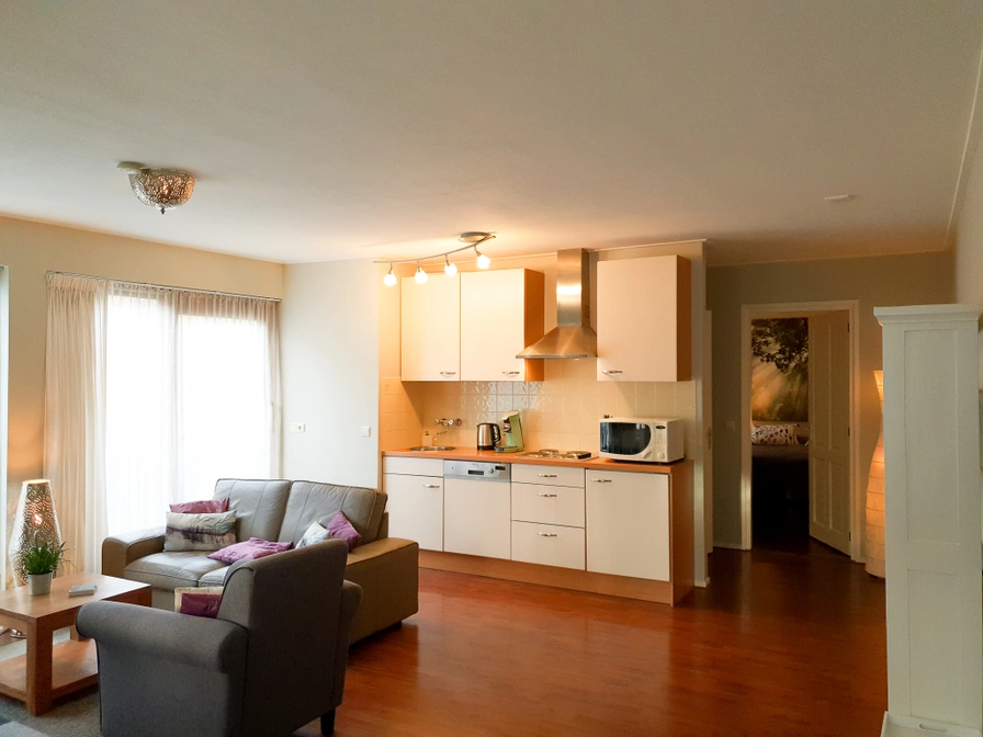 Diese gemütliche Zwei-Personen-Luxuswohnung befindet sich im Erdgeschoss dieses freistehenden Apartmentkomplexes. Sie treten durch den Flur in die offene Küche ein. Diese ist komplett ausgestattet mit Geschirrspüler, Mikrowelle, Elektroherd und Sandwichmaker. Angrenzend befindet sich eine gemütliche Sitzecke mit Doppelsofa, Sessel und Fernseher (Netflix). Vor dem Fenster befindet sich ein Essbereich mit einem runden Tisch. Vom Wohnzimmer aus betreten Sie das Schlafzimmer mit einem Doppelbett. Das Badezimmer verfügt über eine Regendusche / Handbrause, Waschbecken und Toilette. Die Wohnung hat auch eine Terrasse, auf der Sie draußen die Sonne genießen können.