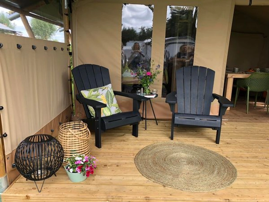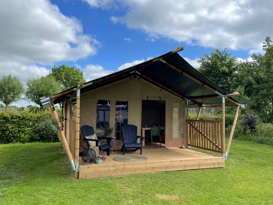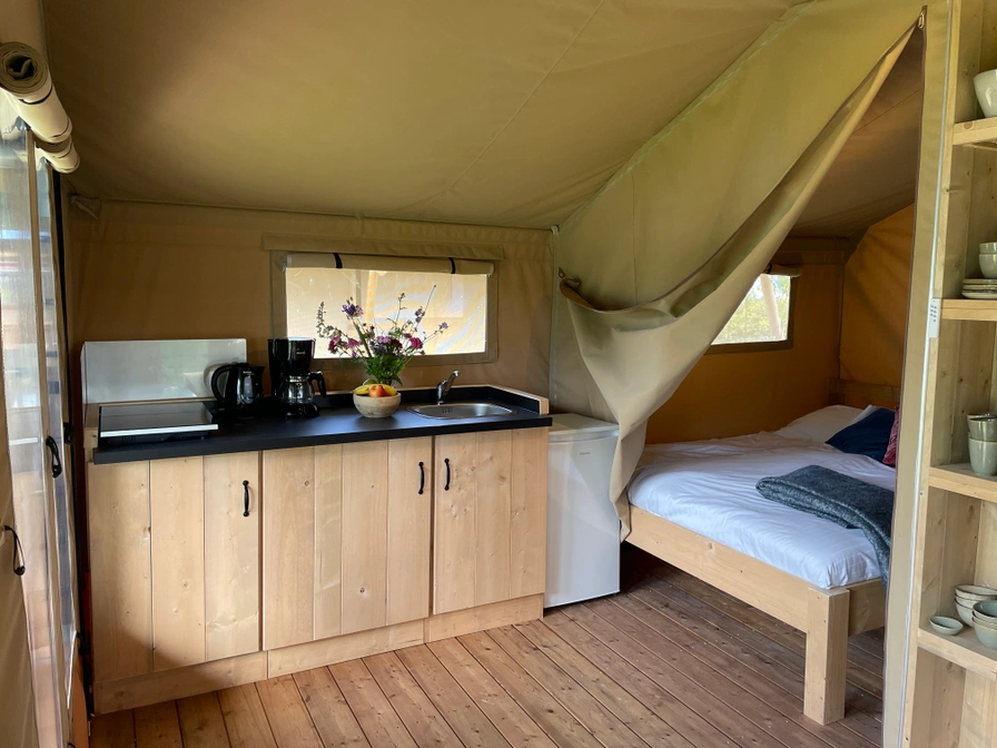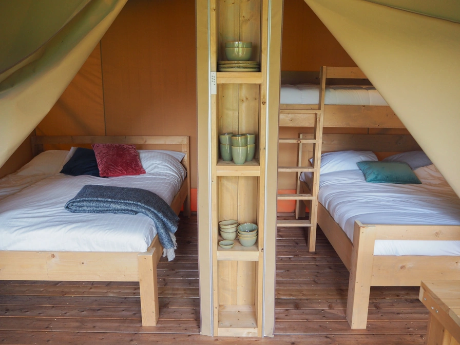Der Campingplatz verfügt über zwei robuste Safarizelte für fünf Personen. Die Zelte sind modern und luxuriös eingerichtet. Die Vorderseite des Safarizeltes lässt sich komplett öffnen, was bei schönem Wetter ein herrlich offenes Gefühl vermittelt. Jedes Zelt verfügt außerdem über eine Terrasse mit Markise, sodass Sie auch bei schlechtem Wetter bequem draußen sitzen können. Im Zelt finden Sie eine geräumige und gemütliche Vorkabine zum Entspannen. Die Küche ist komplett ausgestattet und verfügt über fließendes Wasser. Im Küchenschrank stehen Töpfe und Geschirr bereit, um all die köstlichen Speisen zu servieren, die Sie auf dem Elektroherd zubereiten. Die Küche ist außerdem mit einem Kühlschrank, einer Kaffeemaschine und einem Wasserkocher ausgestattet. Das Zelt verfügt über zwei Schlafkabinen. Beide Kabinen sind mit einem Doppelbett (140 × 200 cm) ausgestattet, und in einem der Zimmer befindet sich zusätzlich ein Etagenbett. Bettwäsche ist inklusive, sodass Sie unbeschwert schlafen können. Obwohl die Safarizelte keine eigenen Sanitäranlagen haben, können Sie das geräumige, moderne Sanitärgebäude auf dem Campingplatz nutzen und dort kostenlos duschen. Um diese Unterkunft zu buchen, müssen Sie den Vermieter direkt kontaktieren.