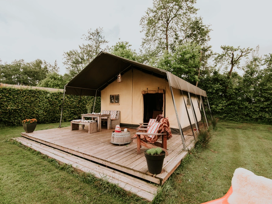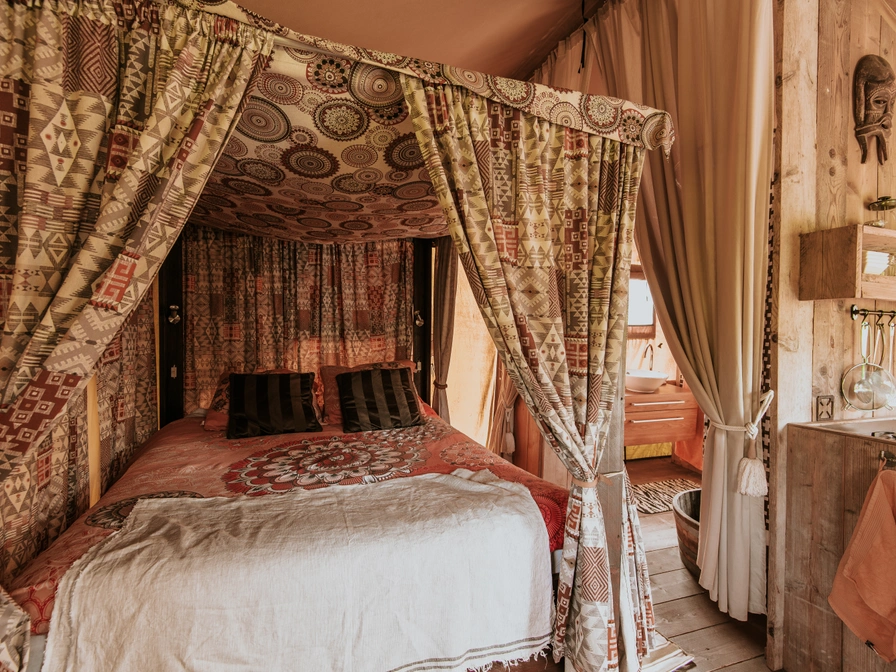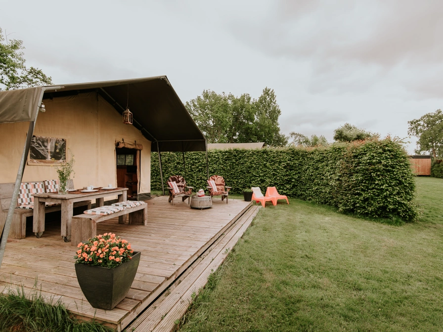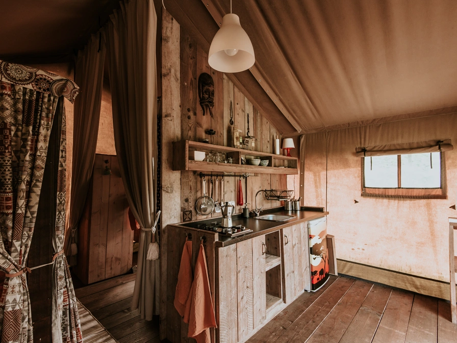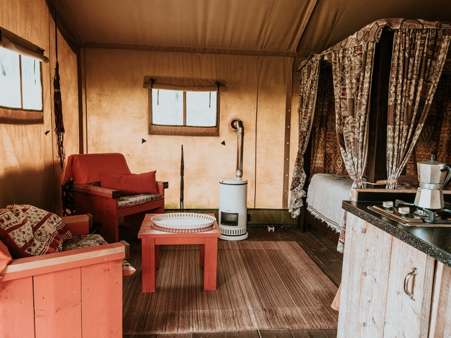 Im Safarizelt „Jenseits von Afrika“ tauchen Sie völlig in die Atmosphäre Afrikas ein, denn dieses Zelt ist im Kolonialstil eingerichtet. Dieses Safarizelt verfügt über ein Doppelbett, eine voll ausgestattete Küche, eine gute Regendusche und eine separate Toilette. An einem kühlen Abend können Sie die schöne Gasheizung nutzen. Vor dem Safarizelt gibt es eine schöne Veranda, auf der Sie draußen essen und die Sonne genießen können. Also ideal!