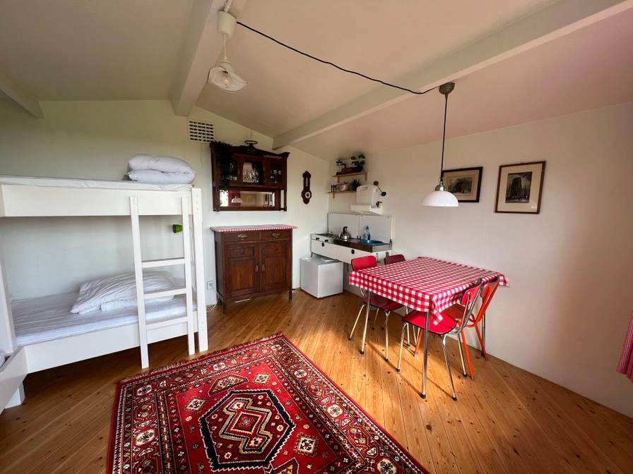 Diese Wanderhütte bietet einen schönen Blick über die Wiesen. Öffnen Sie die Türen oder schauen Sie aus dem Fenster und genießen Sie sofort Ruhe und Weite. Die Wanderhütte ist zwar nicht groß, aber für vier Personen voll ausgestattet. Es gibt eine Küche mit ua Gasherd und Kühlschrank, zwei Etagenbetten mit je einem Kopfkissen und einer Bettdecke sowie einen Tisch mit vier Stühlen. Bettwäschepakete können mit Ihrem Aufenthalt gemietet werden. In der Wanderhütte gibt es keine eigenen Sanitäranlagen, aber das Sanitärgebäude ist fußläufig erreichbar und kann genutzt werden.