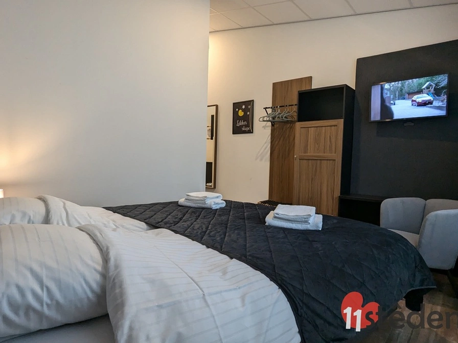 11Stedenkamer Snits gehört zusammen mit vier weiteren Zimmern zum 11Stedenhuis. Es befindet sich auf dem Gelände von De Witakker in Rijs. Jedes Zimmer bietet Platz für zwei Personen. Der Schlafbereich ist mit zwei bequemen Kingsize-Hotelbetten, viel Stauraum, Kleiderbügeln und einem Sessel ausgestattet. Der 42-Zoll-Digitalfernseher bietet ein Standardprogramm, und Sie können Ihren eigenen Laptop, Ihr Telefon oder Ihr Tablet problemlos über den HDMI-USB-C-Anschluss anschließen. Das Zimmer verfügt über ein geräumiges, abschließbares Badezimmer mit Frei-/Besetzt-Schloss, ausgestattet mit Dusche und WC. Ein Spiegelschrank mit Toilettenartikeln und ein Haartrockner sind ebenfalls vorhanden. Die Duschkabine verfügt über eine komfortable Regendusche für einen entspannten Start in den Tag. Jedes Zimmer verfügt außerdem über eine Küchenzeile mit Kühlschrank, Stauraum, Spüle und Kombi-Mikrowelle. Die runde Sitzecke kann als Arbeitsbereich oder für eine einfache Mahlzeit genutzt werden.