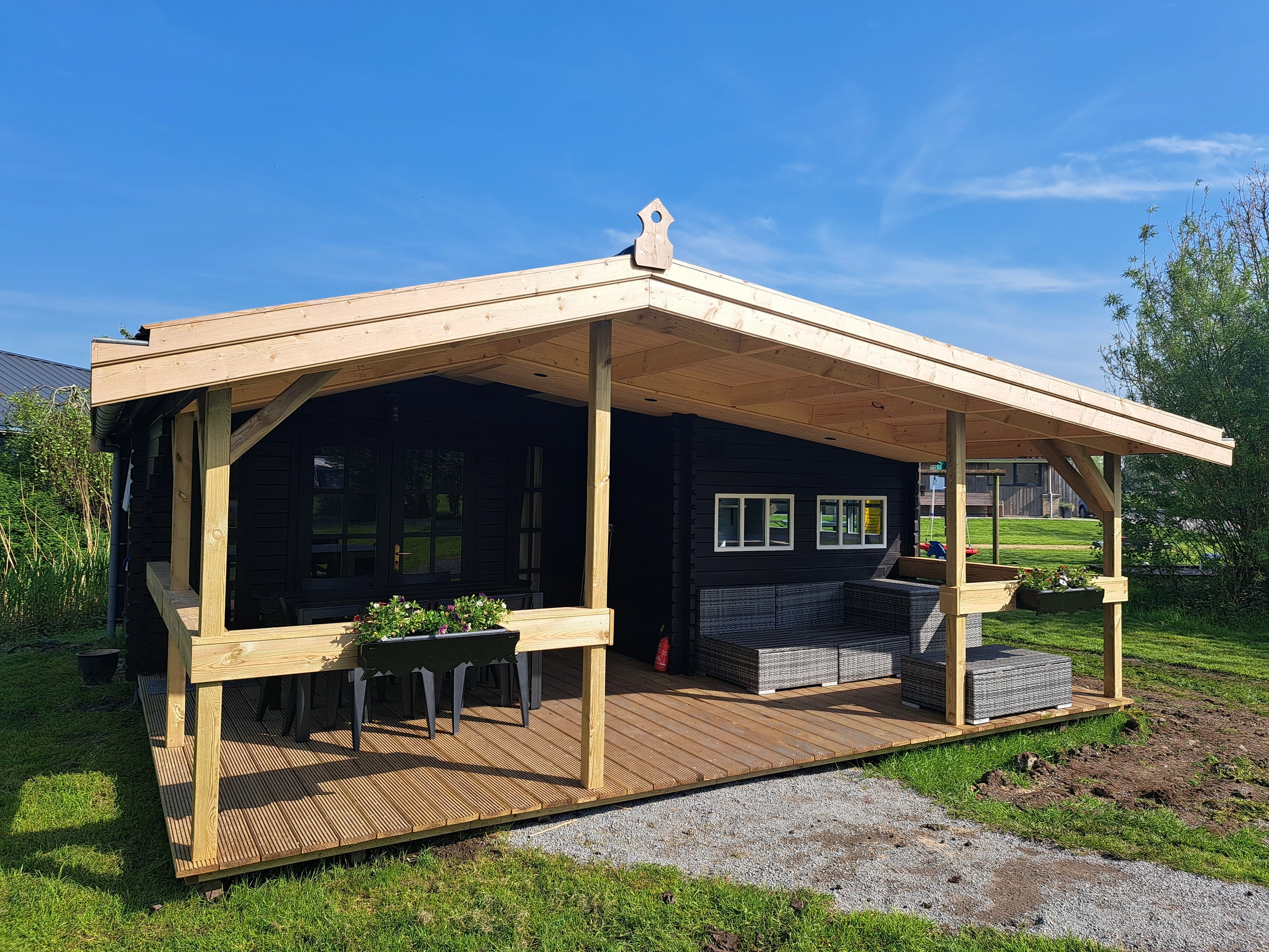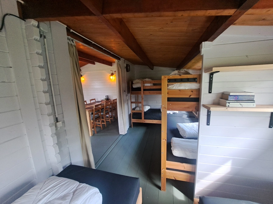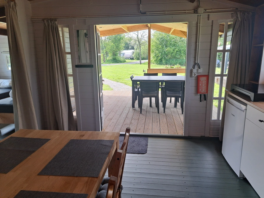 Ein schönes und gemütliches Blockhaus für bis zu 6 Personen. Wenn Sie hereinkommen, befindet sich auf der linken Seite eine Küchenzeile mit Herd, Küchenutensilien, Besteck und Porzellan inklusive, Kaffeemaschine (Dolce Gusto), Kühlschrank und Induktionskochfeld für zusätzlichen Komfort. Etwas weiter links befindet sich außerdem ein Esstisch. Das Blockhaus verfügt über 2 Einzelbetten und 2 Etagenbetten. Diese Unterkunft verfügt über eine überdachte Terrasse, sodass Sie auch bei Regenwetter die Natur genießen können. Das Sanitärgebäude befindet sich in unmittelbarer Nähe der Blockhütte. Mitzubringen sind: Bettlaken, Bettbezug und Kissenbezug.