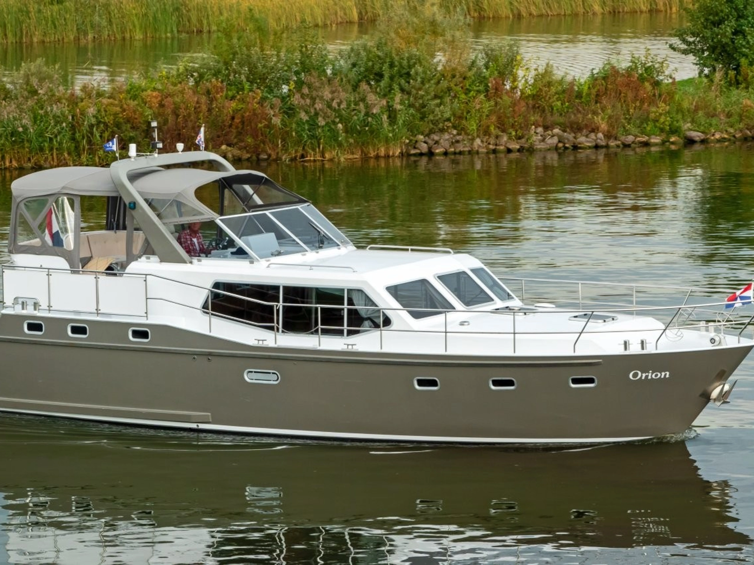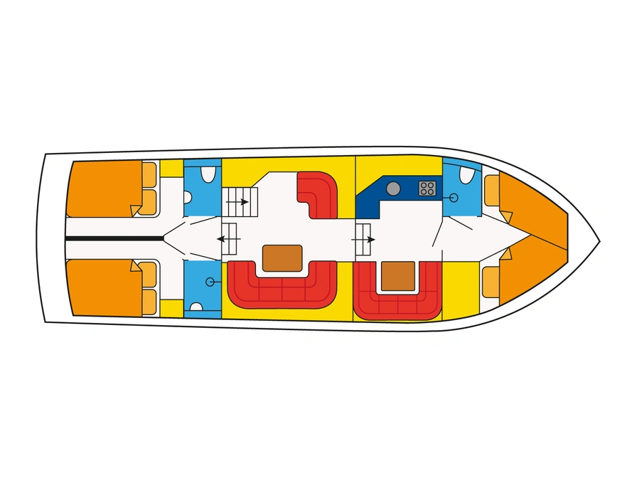 Die Orion ist eine geräumige Motoryacht für bis zu acht Personen. An Bord befinden sich drei Doppelkabinen, jeweils für zwei Personen geeignet. Zwei dieser Kabinen verfügen über ein Doppelbett, die dritte über zwei Einzelbetten. Sollten Sie acht Personen an Bord unterbringen wollen, lässt sich die Sitzgruppe neben der Kombüse problemlos in ein zusätzliches Doppelbett umwandeln. Die Yacht ist großzügig geschnitten und bietet drei Toiletten, von denen zwei zusätzlich mit einer Dusche ausgestattet sind. Der Wohnbereich verfügt über mehrere komfortable Sitzgruppen mit viel Platz für alle. Das Deck ist komplett ausgestattet, inklusive Gaskochfeld und Kühlschrank. Die Motoryacht wird vom Achterdeck aus gesteuert. Die erhöhte Sitzposition bietet hervorragende Rundumsicht, und dank der komfortablen Außensitzgruppe müssen Sie nicht allein sitzen. Ein großes Sonnensegel über dem Achterdeck spendet Schatten. Um diese Yacht zu buchen, kontaktieren Sie bitte direkt den Charterer.
