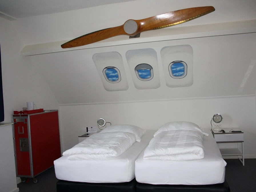 Wie wäre es mit einer Übernachtung in der „Business Class“ von KLM? das schöne 'Flugzeugzimmer' macht dies möglich. Ein Zimmer mit allem Komfort, Badezimmer en-suite und Blick auf den Jachthafen. Sie können nicht widerstehen, die schönen Stühle auszuprobieren!