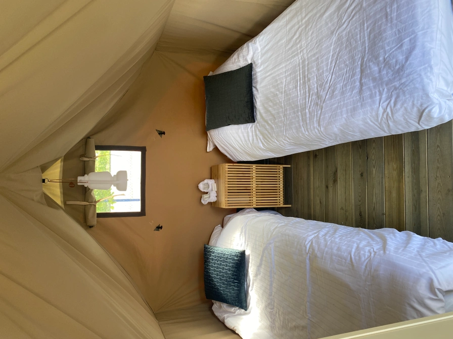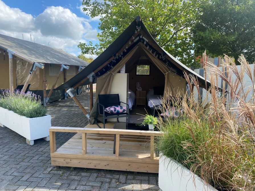 Dieses Safari-Zelt für 2 Personen ist mit bequemen Betten und einem kleinen Schrank zur Aufbewahrung Ihrer Sachen ausgestattet. Die Küchenzeile verfügt über eine elektrische Kühlbox, eine Kaffeemaschine und einen Wasserkocher, sodass Sie morgens ein köstliches Frühstück zubereiten können. Dieses Safarizelt hat keinen Wohnraum, ist aber bestens zum Übernachten und Frühstücken ausgestattet. Das Zelt verfügt über eine geräumige überdachte Veranda mit einem schönen Sitzbereich. Sie können die Sanitäranlagen auf beiden Seiten des Hafens nutzen. Über ein Dach ist das Toilettengebäude stets trocken zu erreichen.