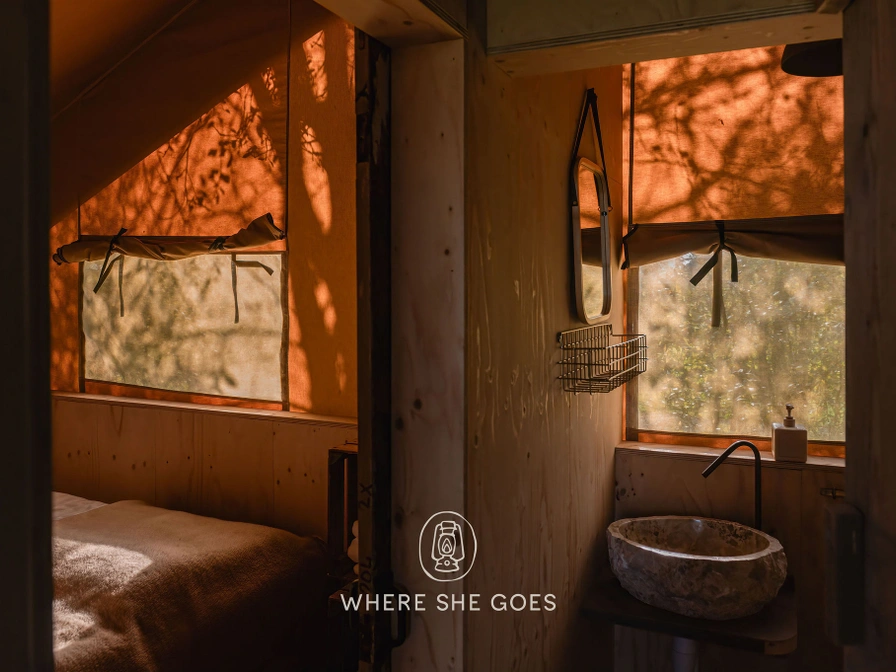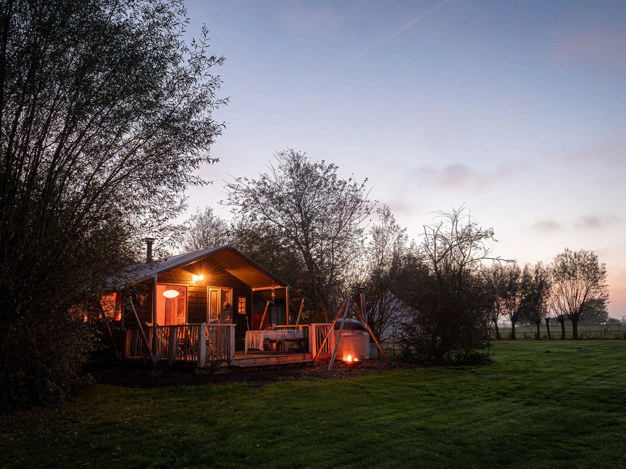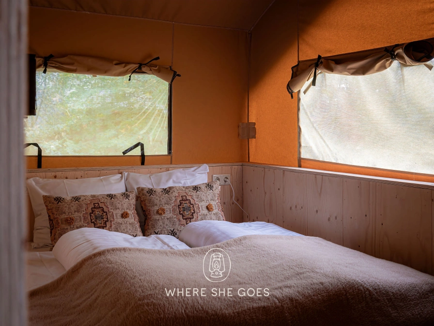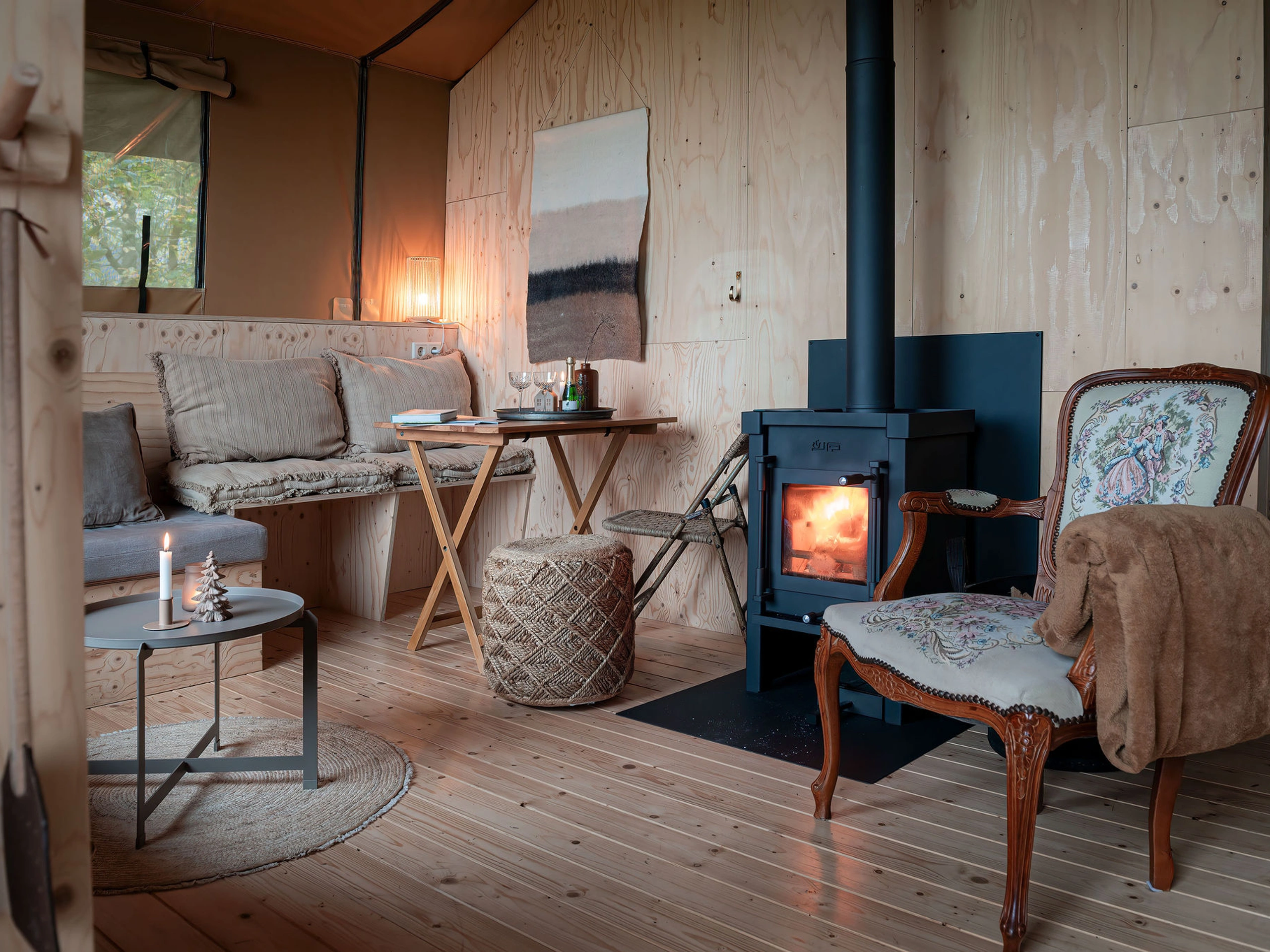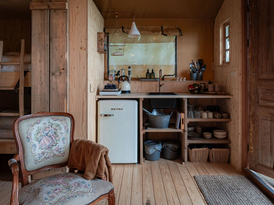 Das Zelt bietet Platz für 2 bis 4 Personen und einen atemberaubenden Blick auf die umliegende Natur durch ein großes Fenster. Ein Holzofen sorgt für wohlige Wärme. Es ist hell und gemütlich eingerichtet und verfügt über ein komfortables Bett und ein Etagenbett. Toilette und Waschbecken sind ebenfalls vorhanden. Die Küchenzeile ist mit einem Induktionskochfeld, einer Kaffeemaschine und Kaltwasser ausgestattet. Strom ist verfügbar. Genießen Sie ein privates, einzigartiges Duscherlebnis im Freien mit Warmwasser. Alternativ können Sie auch die Duschen im Hauptgebäude nutzen. Diese einzigartige Kombination aus Ferienhaus und Zelt bietet die Vorteile eines Zeltes, wie das Lauschen der Naturgeräusche, während der Holzboden Zugluft verhindert. Ein Holzofen sorgt für behagliche Wärme, und im Winter und Herbst stehen beheizte Betten zur Verfügung. Das Zelt besticht zudem durch seine schönen, authentischen französischen Türen. Eine große Terrasse mit Markise und optionalem Whirlpool lädt zum Verweilen ein. Sie können auch im Freien über offenem Feuer kochen und ein Lagerfeuer entzünden. Herrlich! Hier wird es richtig dunkel, und Sie können die Sterne bewundern.
