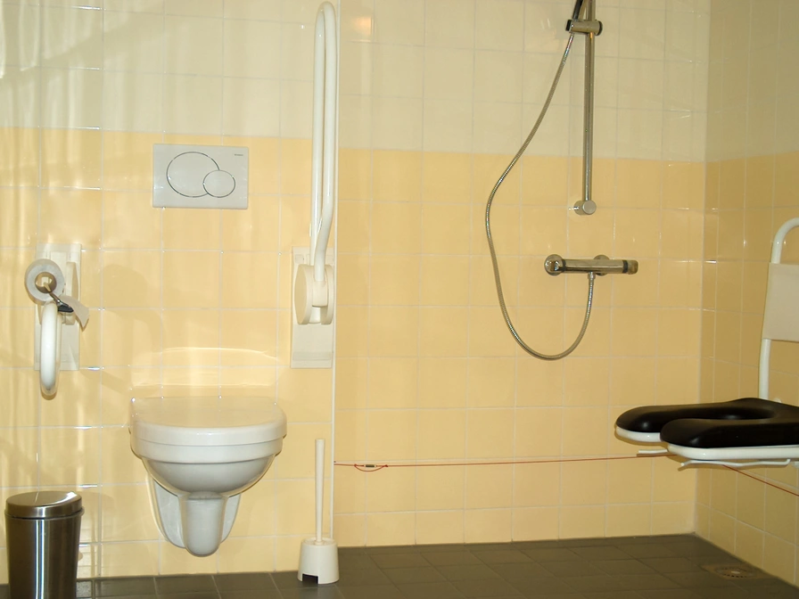 Der ebenerdige, rollstuhlgerechte Bungalow liegt direkt am Wasser und verfügt über 1 Schlafzimmer und 1 Badezimmer. Das Wohnzimmer ist mit einem Doppelschlafsofa und einem Fernseher ausgestattet. Die offene Küche ist mit einer rollstuhlgerechten Arbeitsplatte, einem Kühlschrank mit Gefrierfach, einer Mikrowelle und einer Filterkaffeemaschine ausgestattet. Das Schlafzimmer verfügt über zwei Boxspring-Einzelbetten und kann durch ein Hoch-Tief-Bett ergänzt werden. Das Badezimmer ist mit einer ebenerdigen Dusche, einem klappbaren Duschstuhl, einer Toilette mit Stützen und einem rollstuhlgerechten Waschbecken ausgestattet. Draußen gibt es eine überdachte Terrasse mit Blick auf den Hafen.