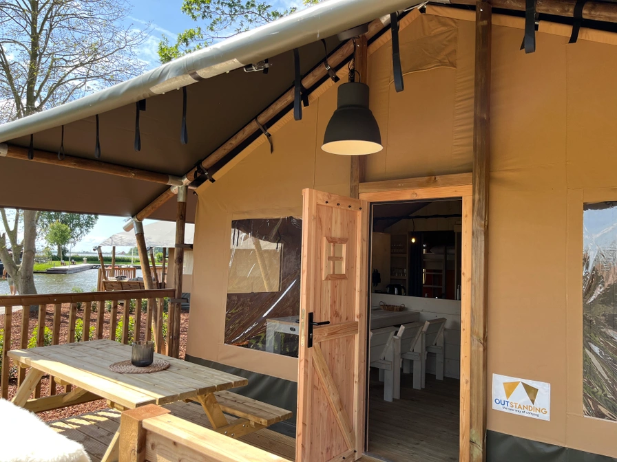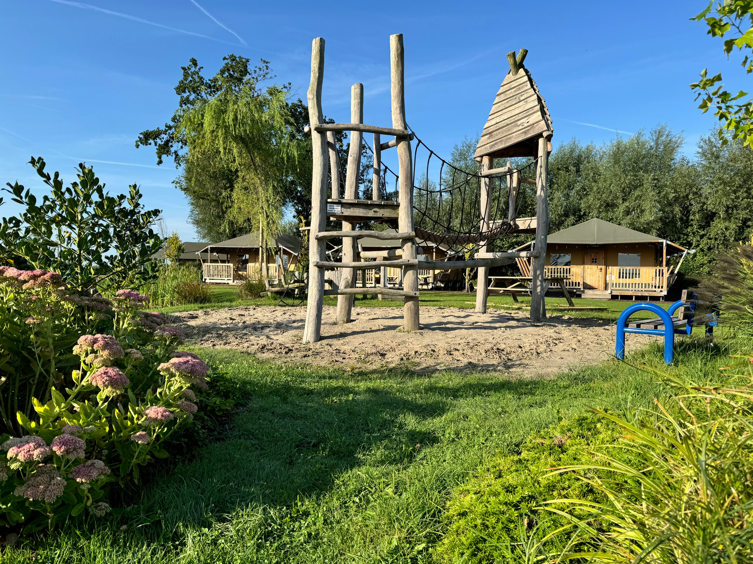 Der Campingplatz, auf dem diese Zelte stehen, ist so angelegt, dass jedes Glamping-Zelt einen Blick auf ein Spielfeld hat. So können sich die Eltern auf dem Lounge-Sofa auf der Veranda entspannen, während die Kinder auf dem Spielplatz spielen oder im Heegermeer baden.