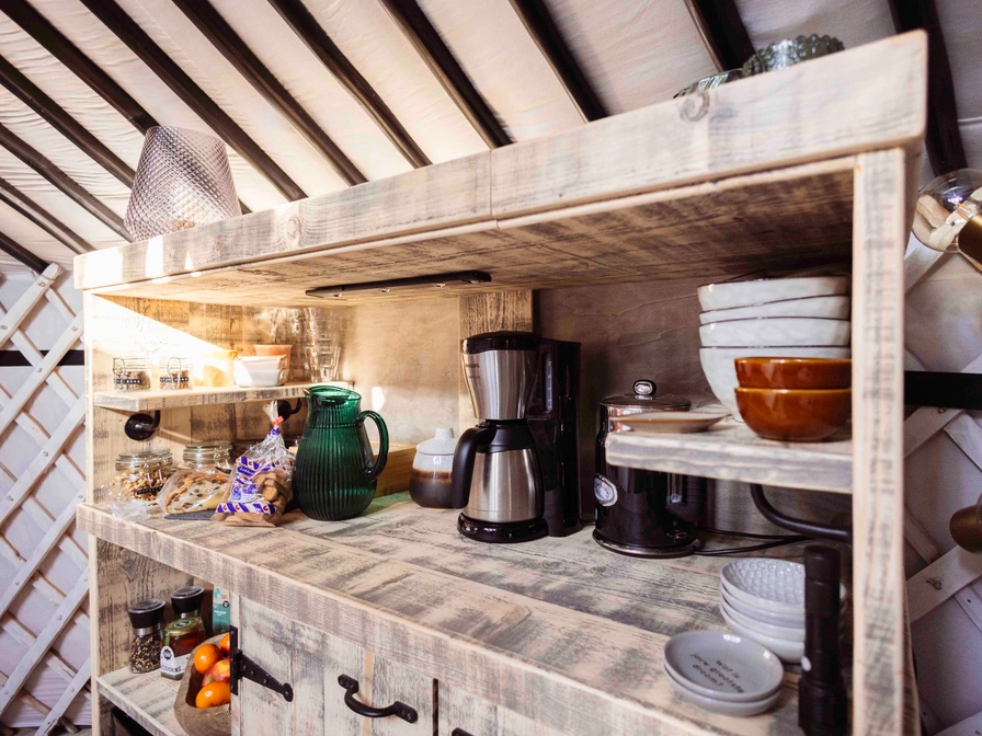 This spacious yurt is equipped with every convenience. With a unique design, wood stove and a cozy coffee/tea corner, you are assured of an excellent stay. There is room for two adults and possibly two children. The sanitary facilities are nearby, equipped with a shower cabin, toilet and sink. Shampoo, shower gel and conditioner are also provided. A hot tub is available near the yurt and can be booked as an option.