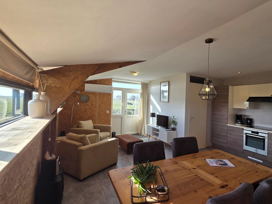 Apartment Lânsicht is located on the ground floor and features a cozy sitting area with two comfortable chairs, a dining table with four chairs, and a smart TV. The kitchen is fully equipped with an induction cooktop, convection oven, coffee maker, refrigerator, and kitchenware. The bedroom has a double bed and wardrobe space. The bathroom has a shower, sink, and toilet. Outside, there's a seating area with views of the meadows and De Snip windmill.
