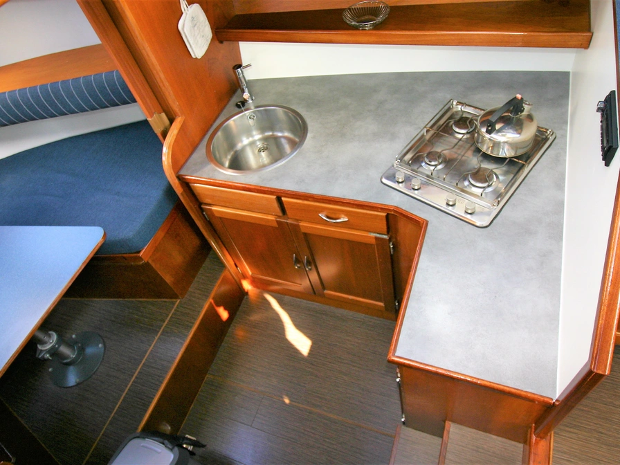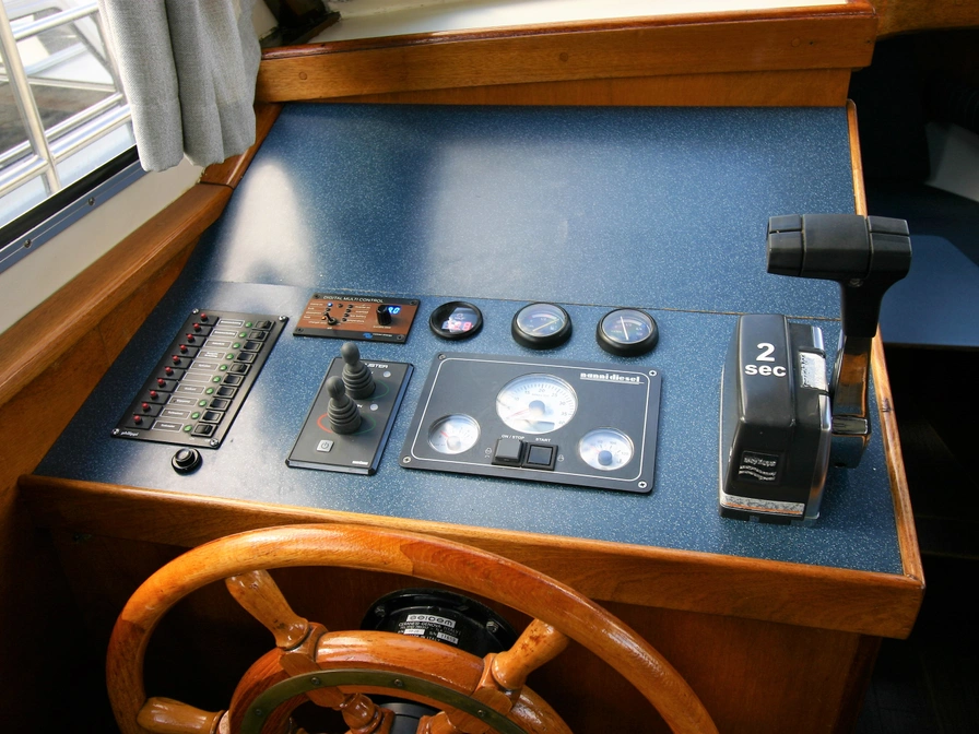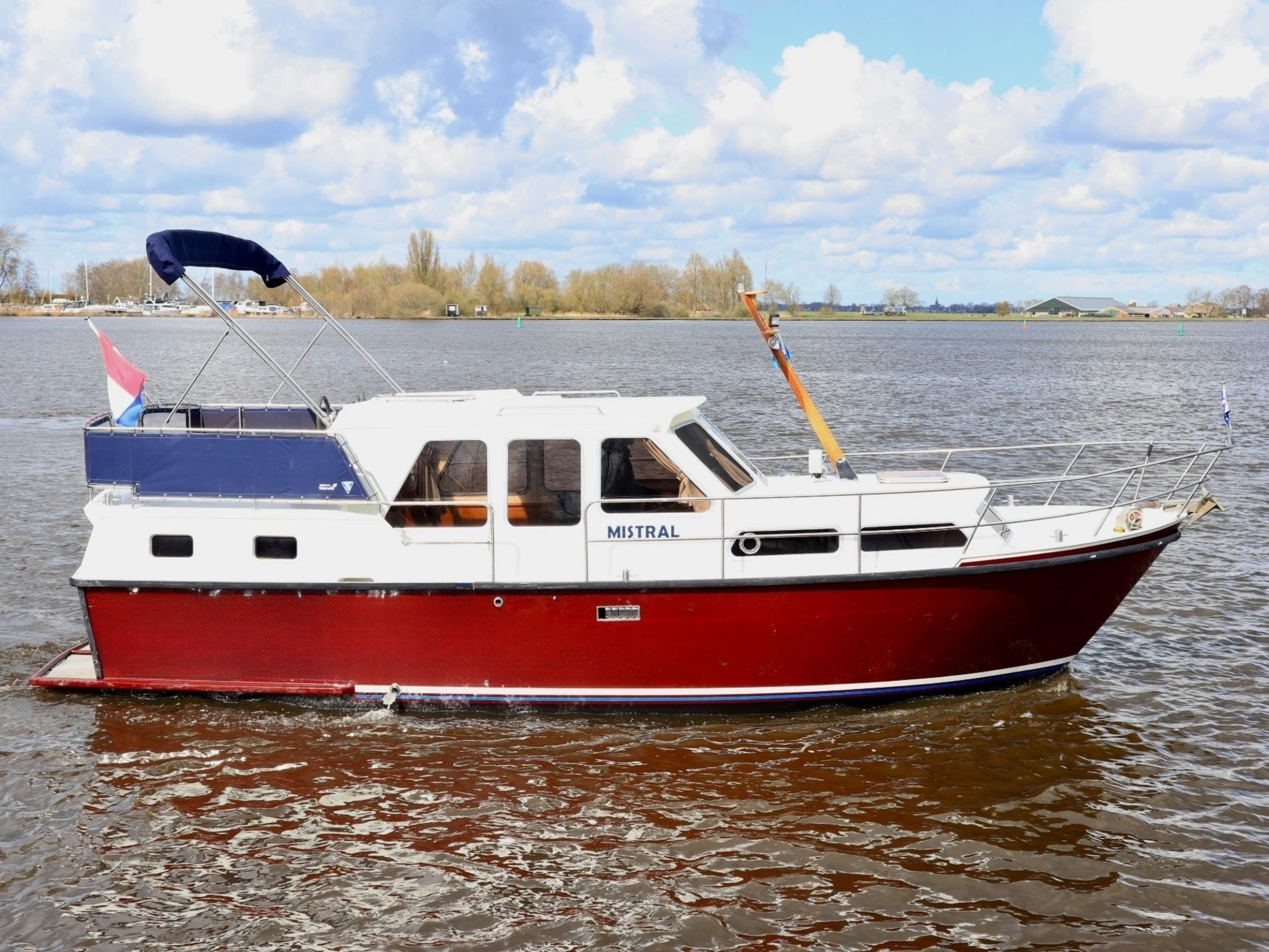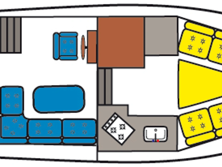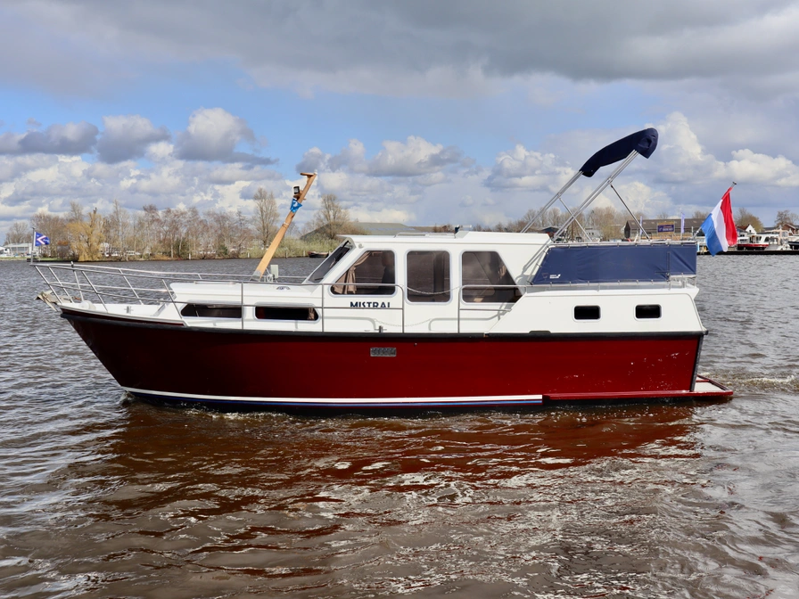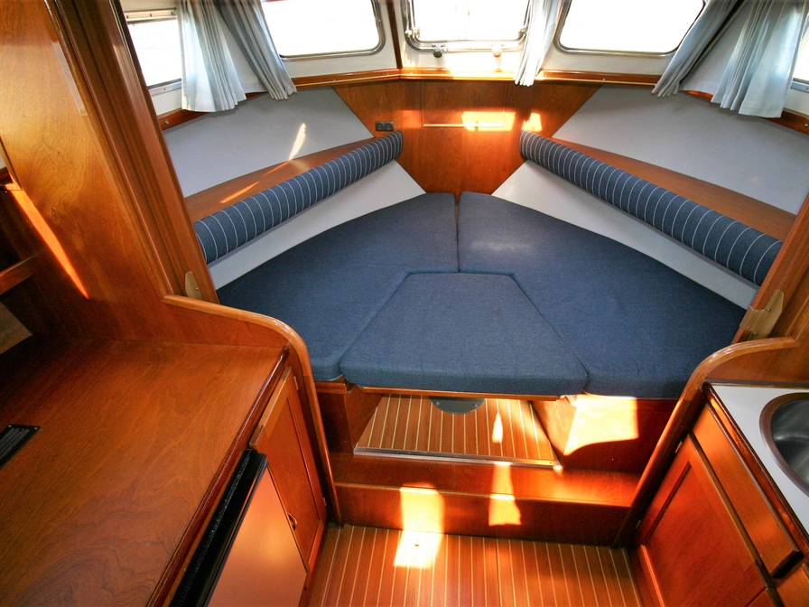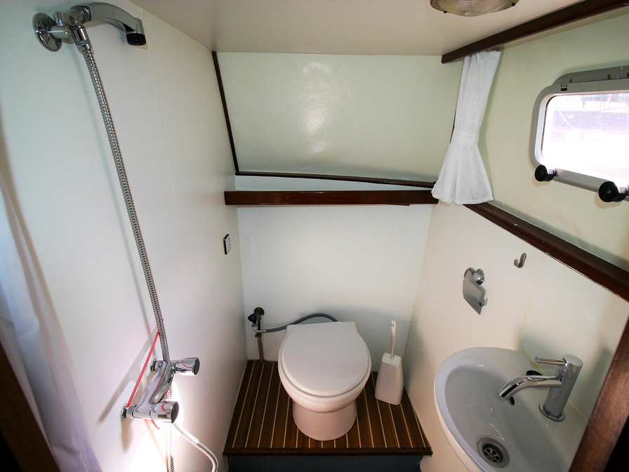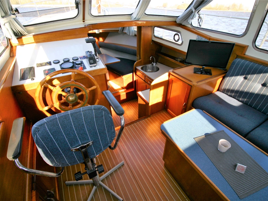 Easy to sail motorboat with a low clearance – perfect for a family or for two people who love comfort. Layout: In the front you will find a cozy dinette that you can convert into a closed double cabin. The spacious kitchen is equipped with a 4-burner stove, refrigerator and a complete inventory for 5 people. In the saloon you have a comfortable sitting area and the steering position. In the back there is a double cabin with extra storage space. There is also a shower, electric toilet and sink on board. Outside you can enjoy the sun deck with second steering position, solar panel, bimini, deck chairs, a table and a swimming platform with swimming ladder. Thanks to the bow and stern thrusters, maneuvering is extra easy. Do you have no sailing experience yet? Then a sailing instruction is mandatory.