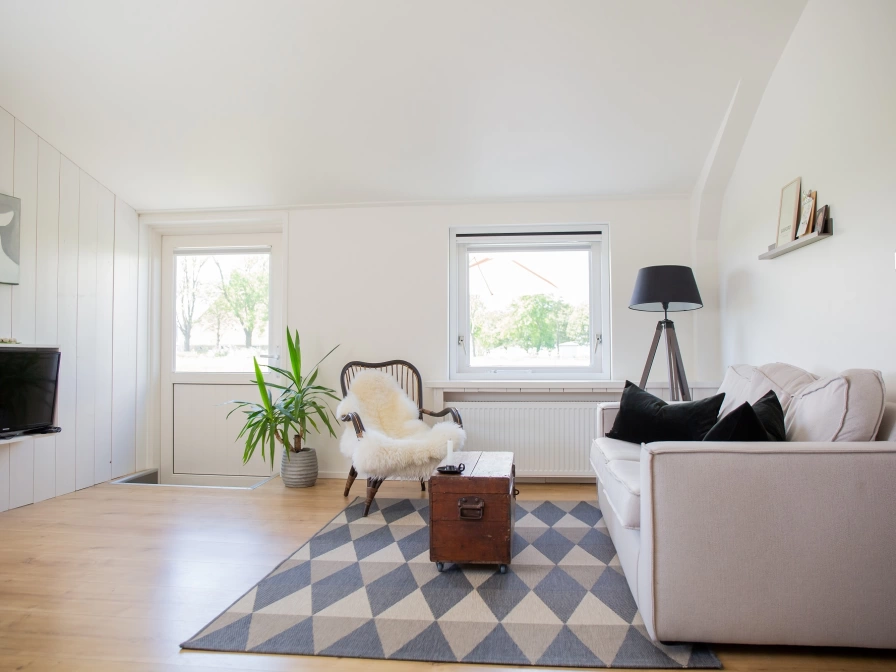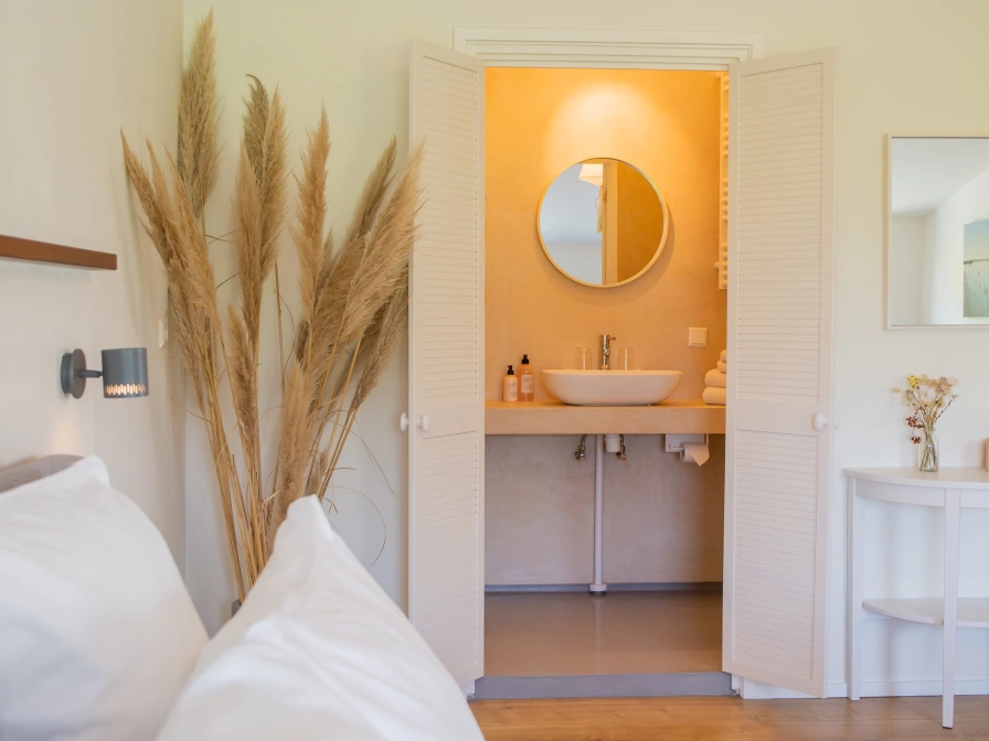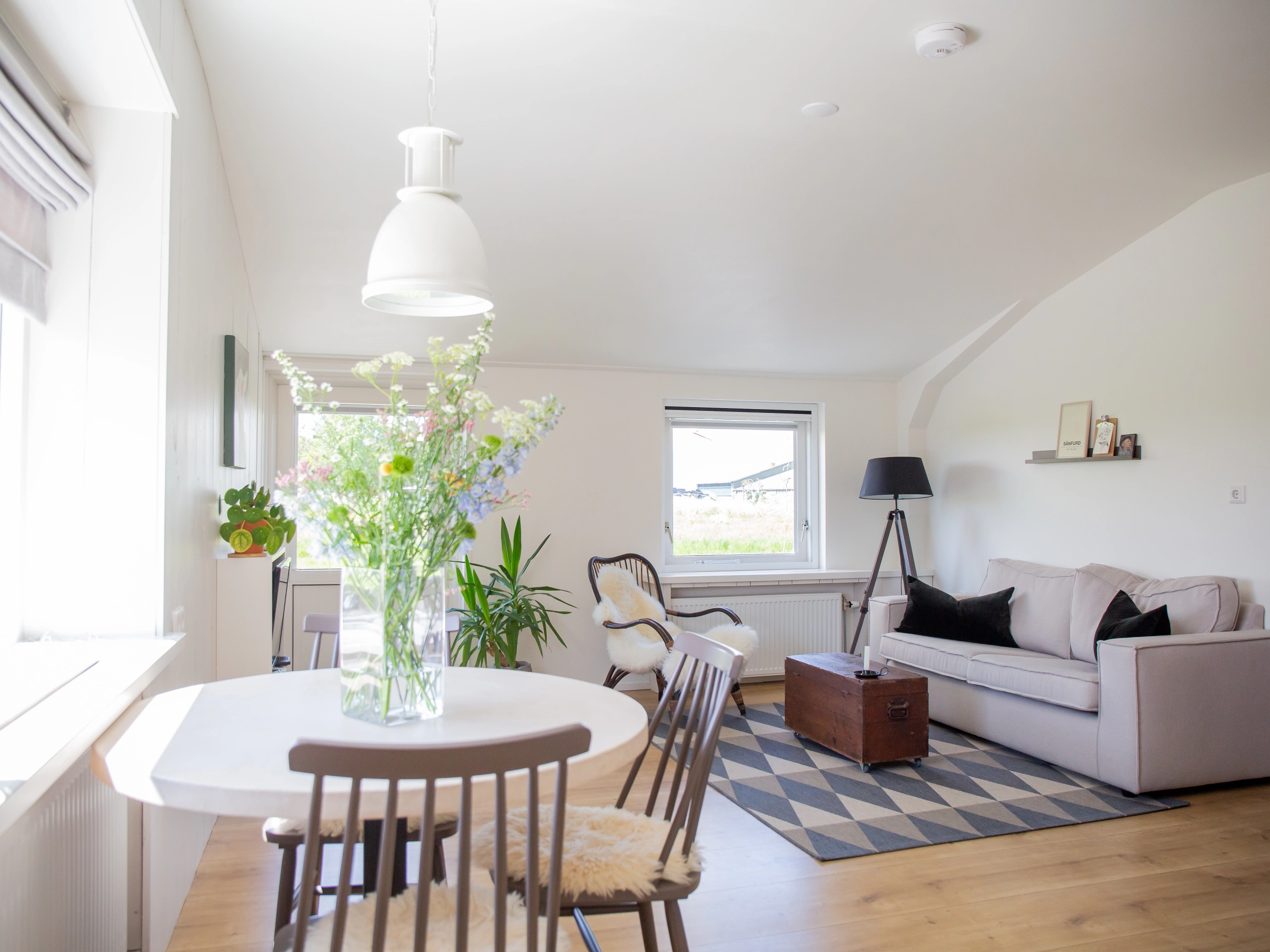 This delightful nature cottage is bathed in natural light and offers views of the meadows, birds, and sheep. The living room features a dining table by the window, a sitting area, and an open-plan kitchen equipped with a dishwasher, refrigerator, stovetop, oven, coffee maker, and kettle. There's a separate bedroom with a sturdy king-size box-spring bed, and a sofa bed for a third person. There's a large walk-in closet and an en-suite bathroom with a sink, walk-in shower, and toilet. Enjoy your private terrace outside! To book this accommodation, please contact the owner directly.