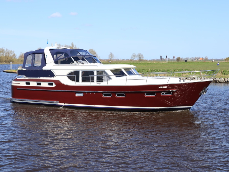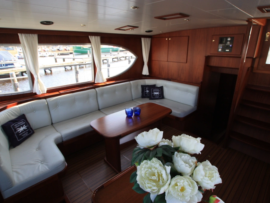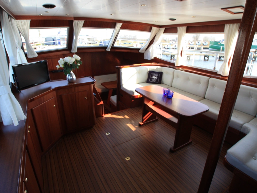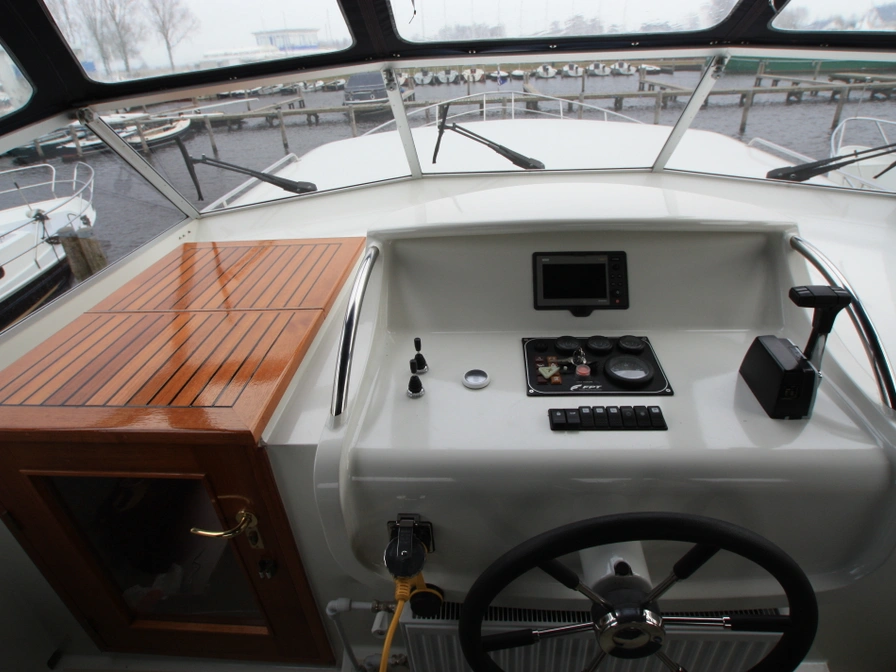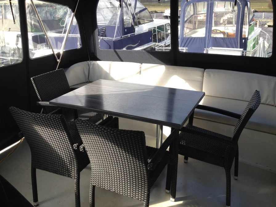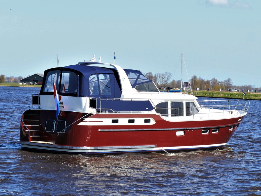 This luxurious and excellent motor yacht offers ample living space for 8 people. It is comfortably and tastefully furnished, making it ideal for families or four couples who want to enjoy a relaxing sailing holiday together. Layout: In the front there is a spacious cabin with a freestanding French bed and its own washbasin. In addition, there is a separate bathroom with shower, washbasin and electric toilet. The kitchen is fully equipped for 10 people and has a 4-burner gas hob, extractor hood, large refrigerator, combination microwave, dinette and plenty of storage space. The large saloon is cosily furnished with a comfortable U-shaped sofa, television and radio/CD player. Central heating ensures a pleasant stay, even in less good weather. In the back you will find three double cabins, each with its own washbasin and sufficient cupboard space. There is also a second bathroom with shower, washbasin and electric toilet. Outside you can enjoy the upper steering position with central heating, GPS, chart plotter, depth gauge, solar panel and a 220V inverter. Thanks to the bow and stern thrusters, you can easily manoeuvre the yacht. The XL convertible tent with fixed bench seat makes the sun deck extra comfortable. The integrated spiral staircase allows you to easily get on or off the boat via the swimming platform with swimming ladder. Please note: if you have no sailing experience, sailing instruction is mandatory.