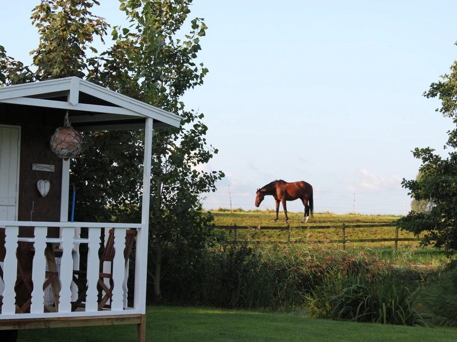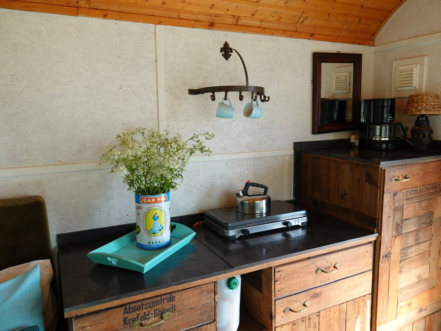 This cosy, unique gypsy wagon is perfect for a romantic stay for two. Your beds will be made upon arrival and a bottle of red wine will be ready! You can start enjoying right away. Fresh bread rolls are delivered every morning. In the gypsy wagon you will find a nice double bed including bedding and heating. The small kitchenette is equipped with a refrigerator, coffee maker and cooking utensils, plates and cutlery. Outside is a veranda with furniture and a barbecue. If you prefer an extensive breakfast, you can order that extra.