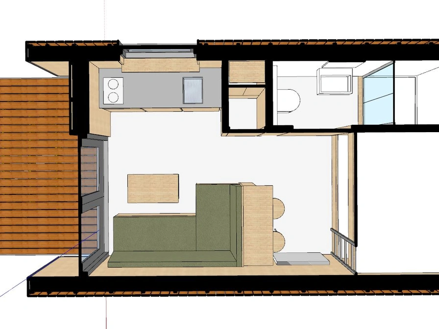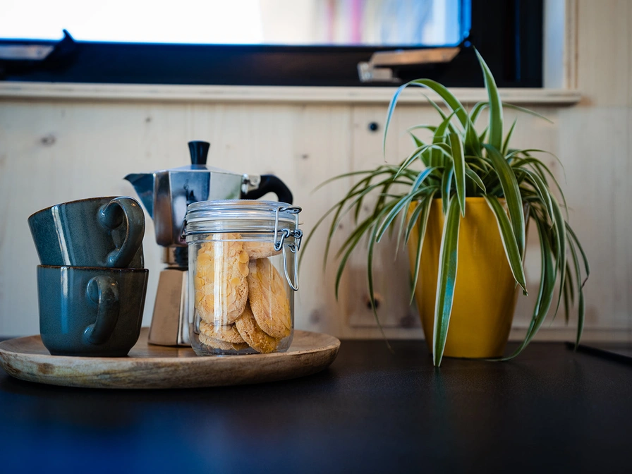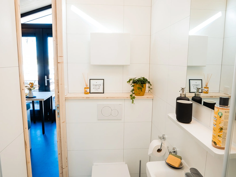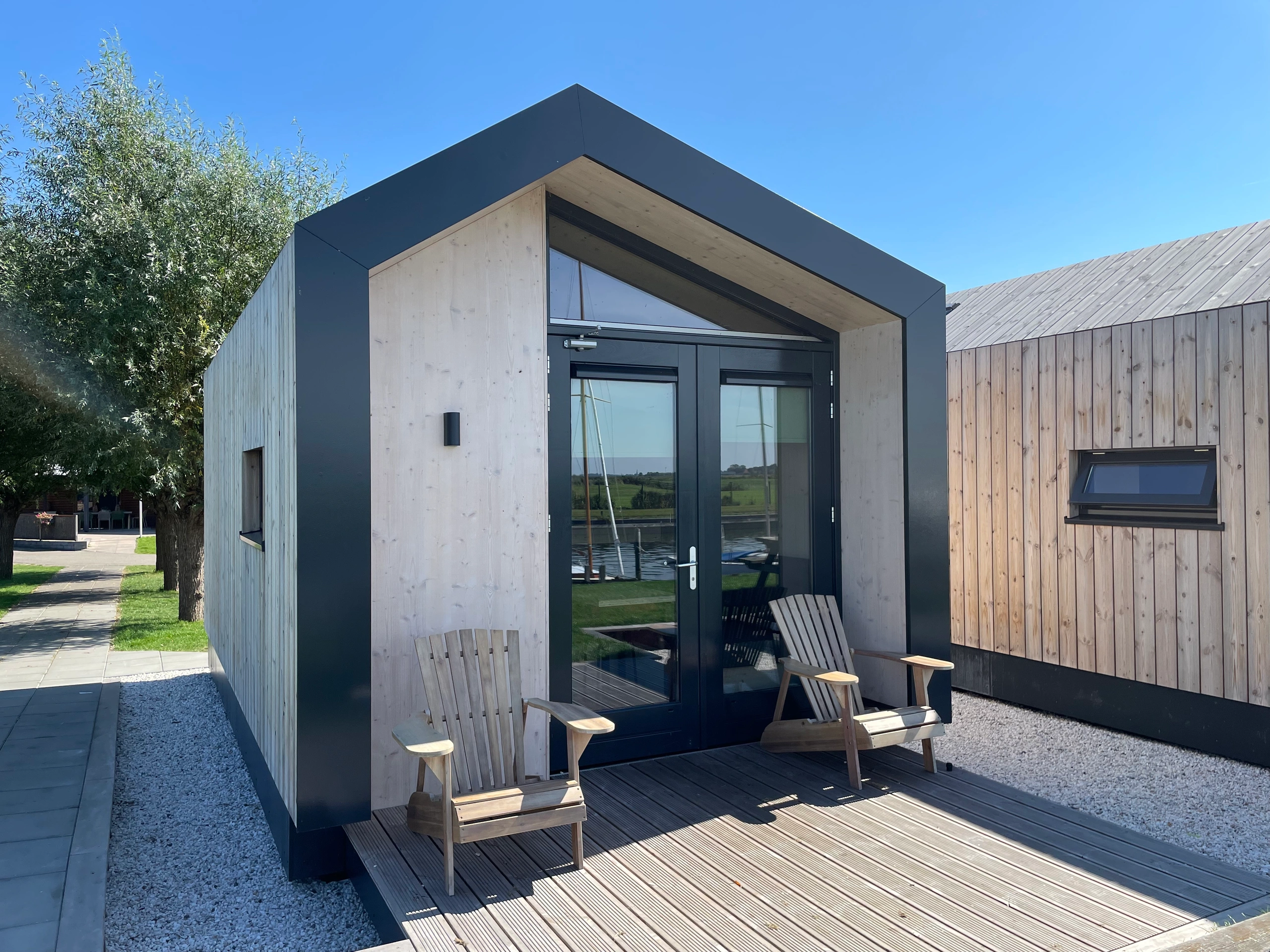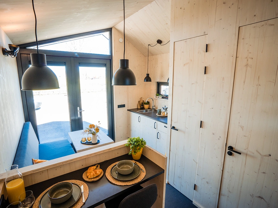 Our three modern holiday homes are located at one of the most beautiful locations of Watersportcamping De Bearshoeke, directly on the water of the Oudegaaster Brekken. These charming tiny houses are luxuriously furnished and fully equipped. You can stay here with a maximum of four people. Each holiday home has an open studio character and has its own bathroom with a shower and toilet. The kitchen is fully equipped with an induction hob, a fridge, a coffee maker and a kettle. In addition, you will find hot and cold running water and all the necessary crockery in the kitchen cupboards. For a cozy meal there is a small bar area inside, and a spacious picnic table is ready on the veranda. The Holiday Home has a bunk bed with two spacious sleeping areas. Bed linen is included as standard, so you can immediately enjoy a relaxing stay.