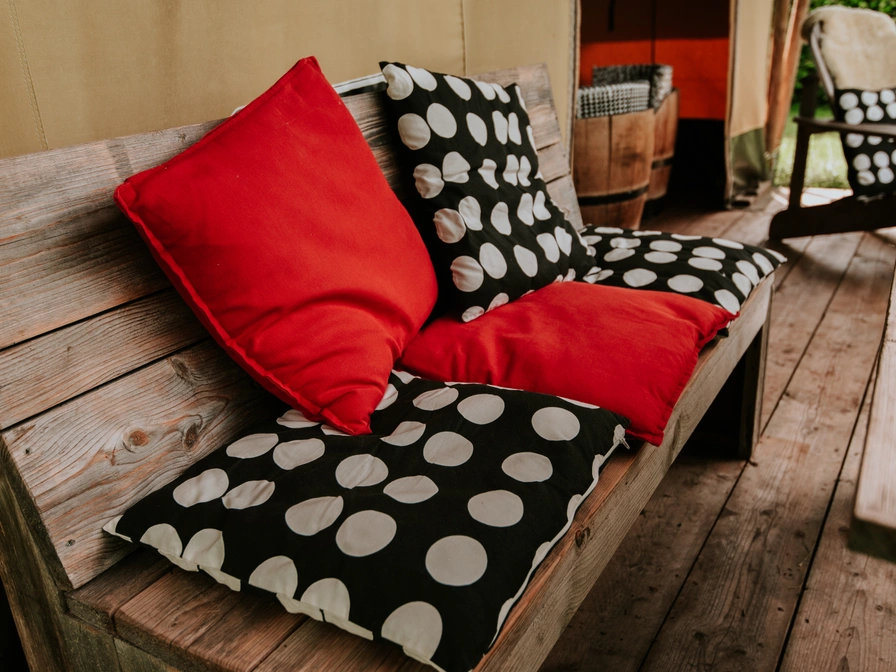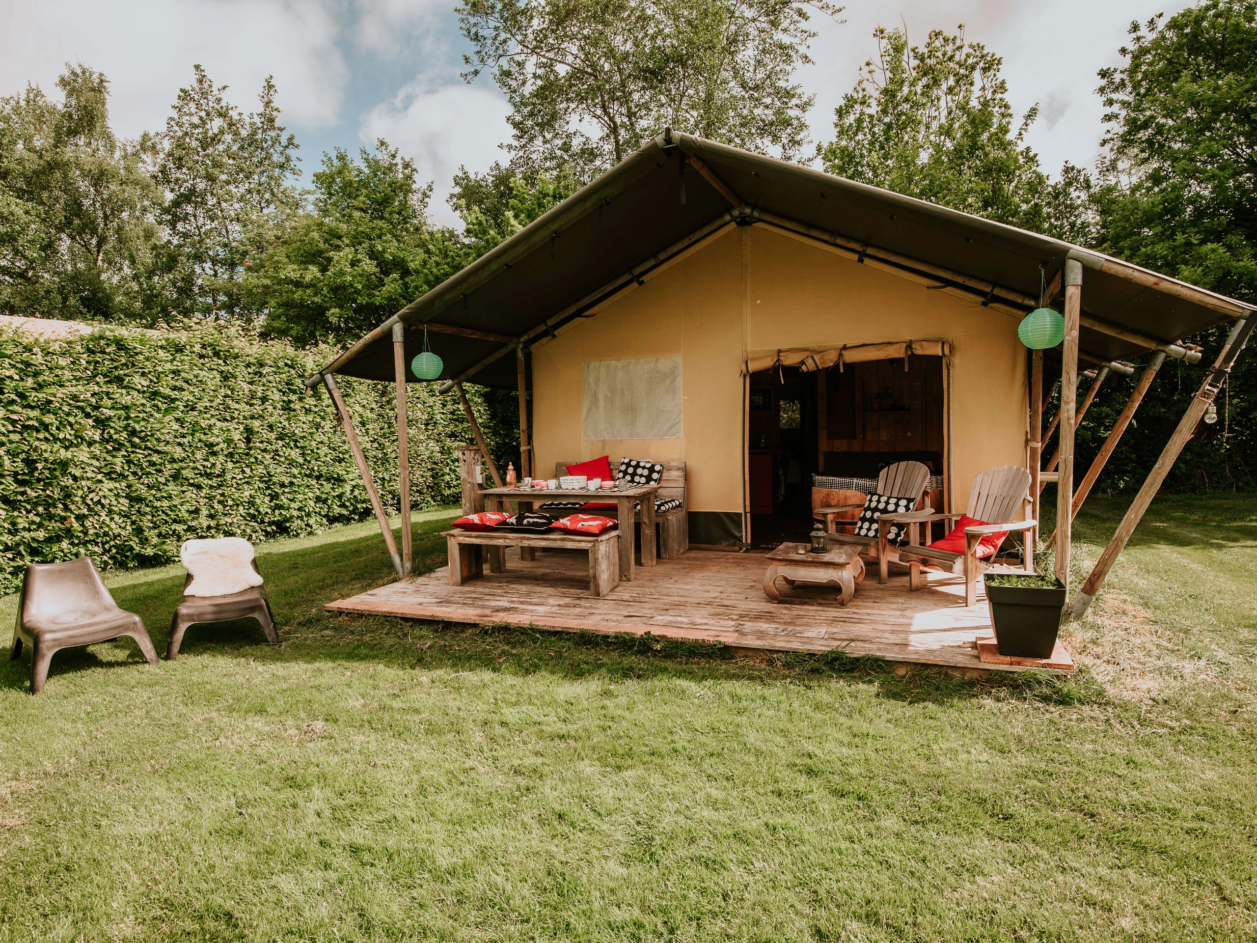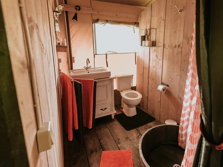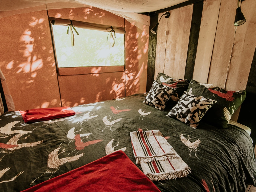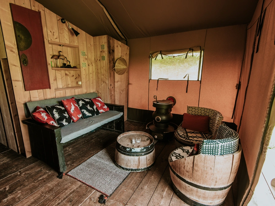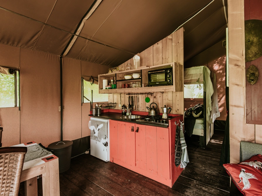 This luxurious safari tent is completely decorated in the theme of the crane. In many Asian countries it is believed that this bird brings good luck. This beautiful tent is suitable for 5 people and has a double bed, a bunk bed and a single bed. The tent is also equipped with a good shower, a separate toilet and a fully equipped kitchen. On a cold evening you can turn on the nice gas heater and enjoy the nice atmosphere around you. You can also use the beautiful veranda and enjoy your meal outside and enjoy the sun.