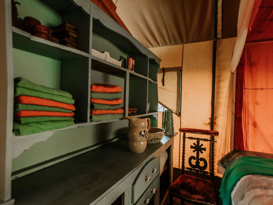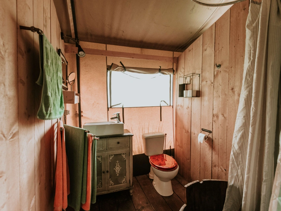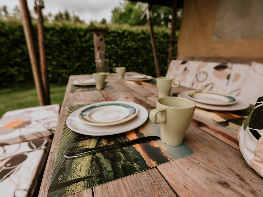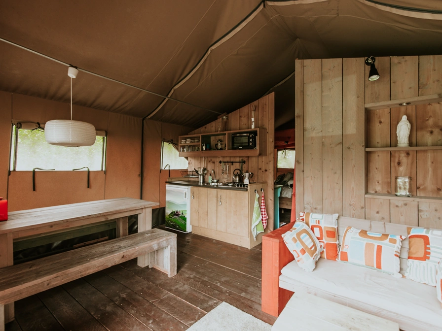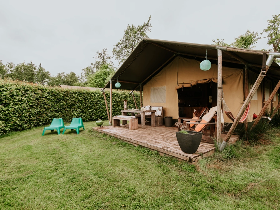 'Tuscany' is a beautifully furnished safari tent in Tuscan style. This tent is suitable for 5 people and equipped with every convenience. There is a double bed, a bunk bed, a single bed, rain shower, separate toilet and fully equipped kitchen. There is a nice gas heater for the cooler evenings. There is a beautiful veranda in front of the safari tent where you can enjoy the beautiful surroundings and, for example, eat your breakfast. Tuscany is perfect for your family or group of friends.