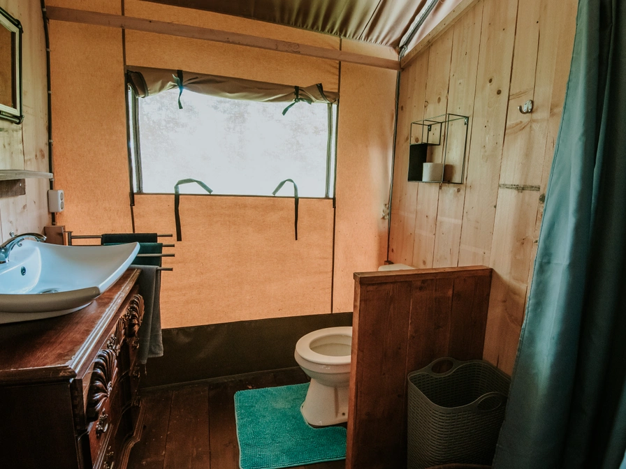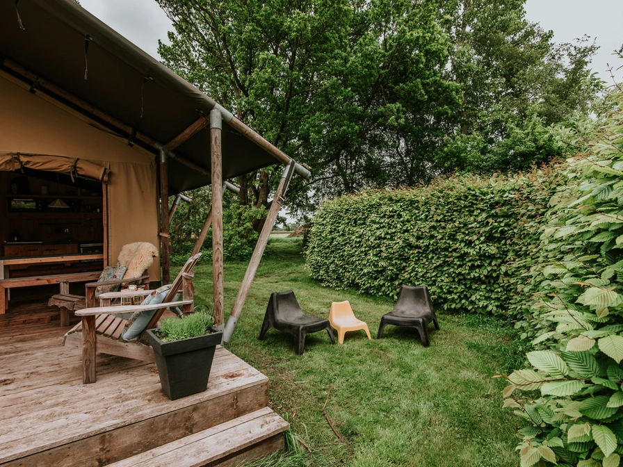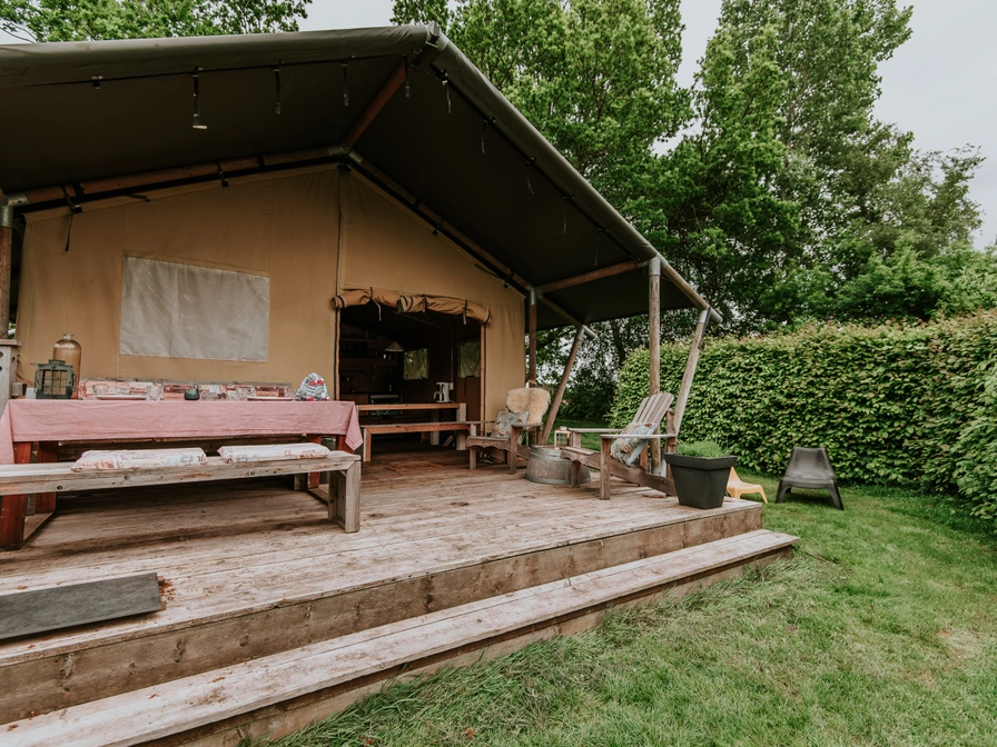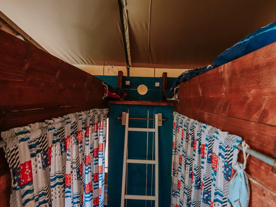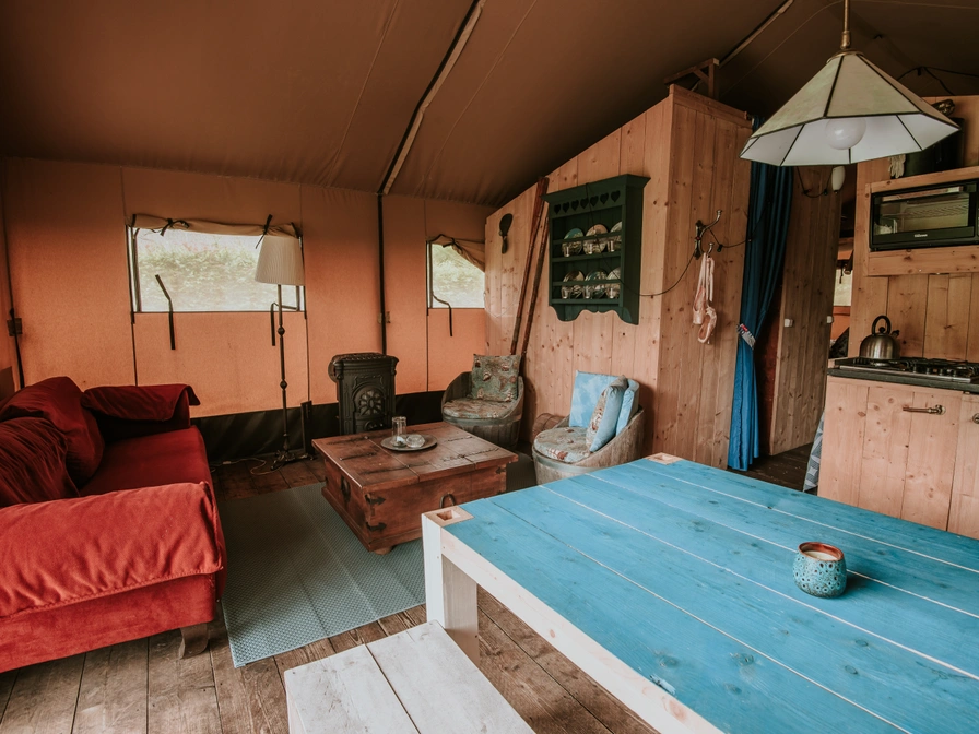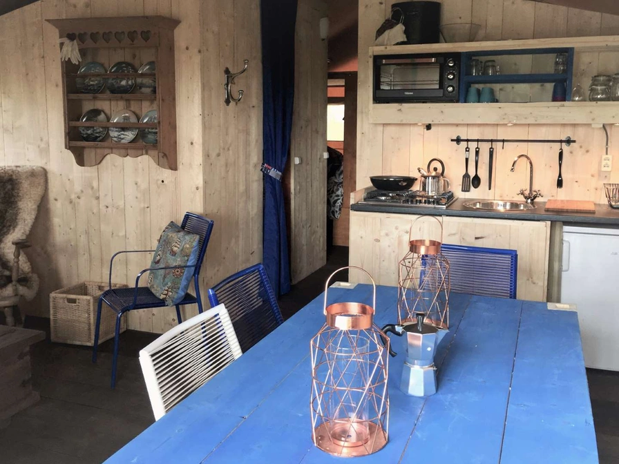 'The Titanic' is a beautiful large safari tent suitable for up to 7 people. The tent is decorated in cheerful blue atmospheres and equipped with every convenience. There is a double bed, a bunk bed, three single beds, a rain shower, separate toilet and fully equipped kitchen. If the evening is cold, there is also a nice gas heater that can be turned on. There is also a beautiful veranda in front of the safari tent where you can sit in relaxing chairs. This is the ultimate destination for a larger group.