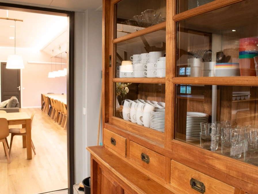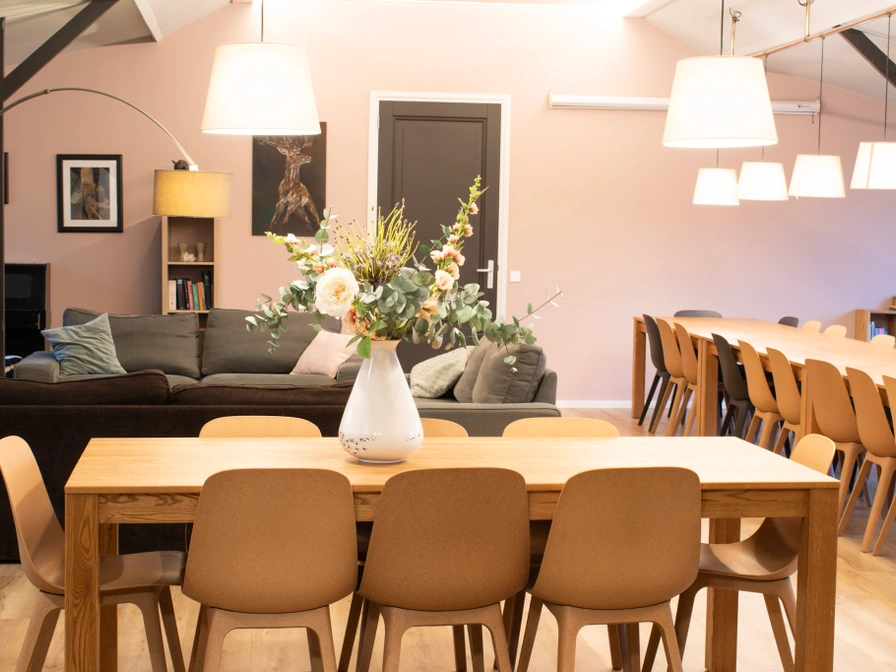 The family house is an attractively furnished house with a comfortable sitting area and spacious open kitchen. A cozy part of the living room is the wood stove that you can use during your stay, wood is supplied! In the family house there are 8 bedrooms, all of which have two or more comfortable single beds. Unique to the house is that each bedroom has its own bathroom! In the living room there are French doors which lead to the terrace of the private garden. A little further is the playground and the outdoor pool.