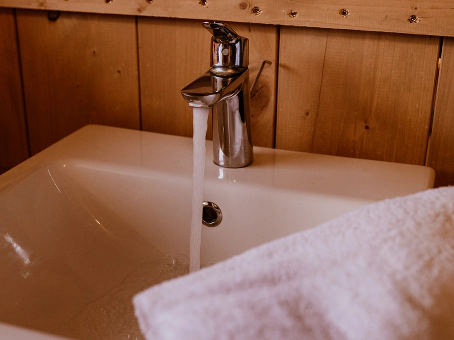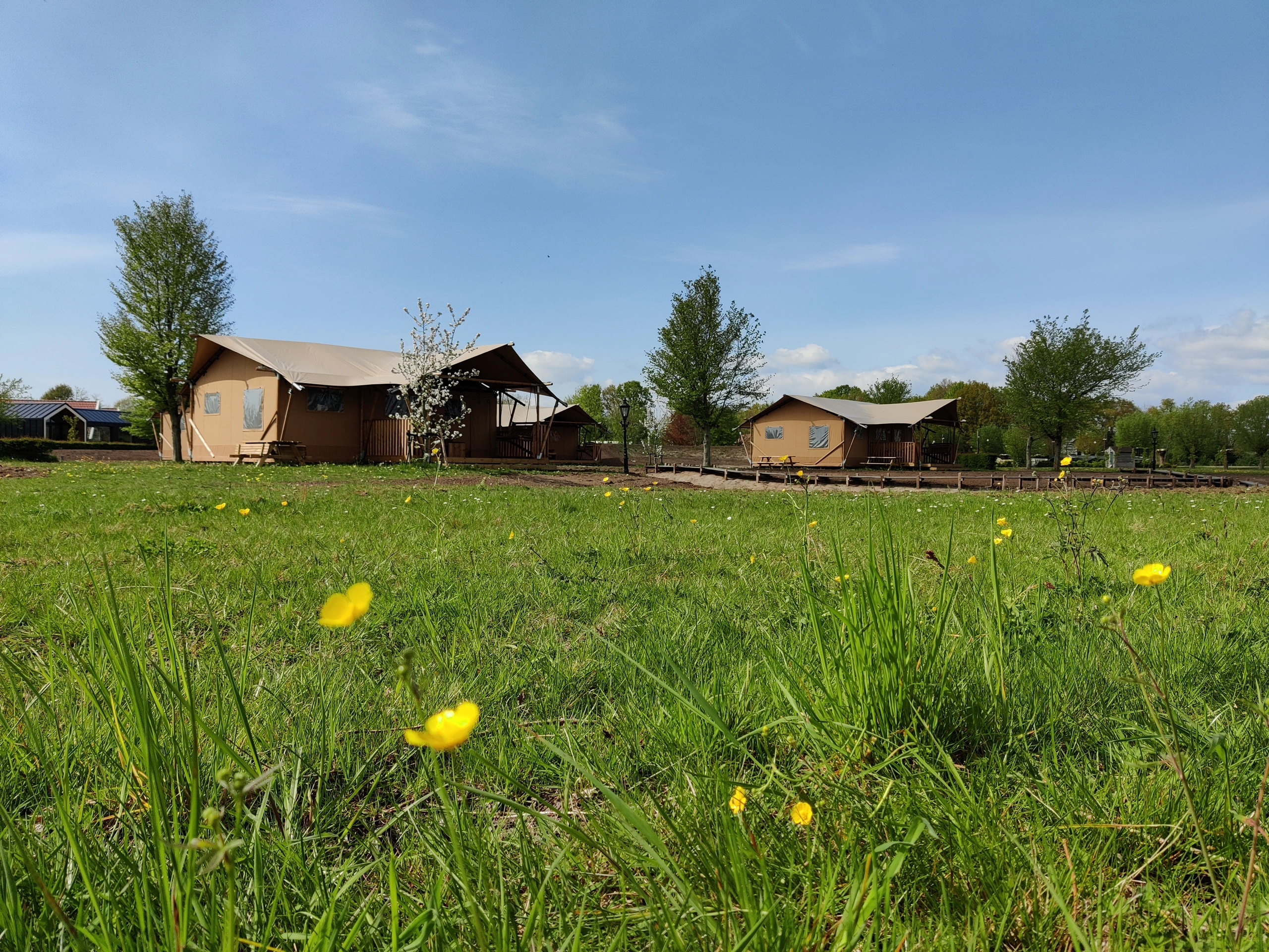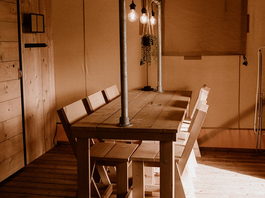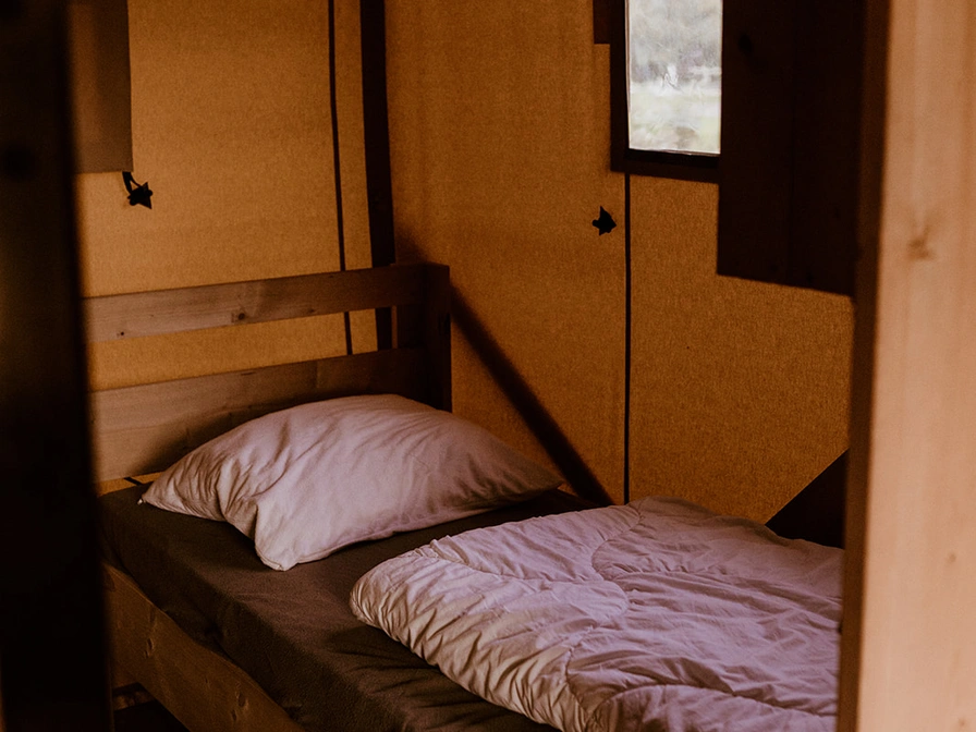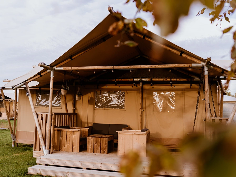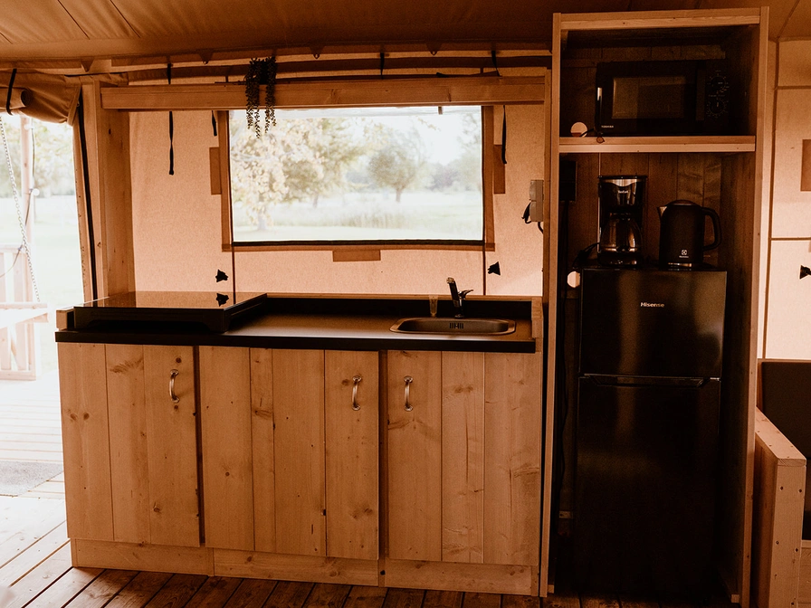 The luxurious five-person tents are equipped with their own kitchen, two bedrooms and a complete bathroom. One of the bedrooms has two box-spring beds, while the other room has a bunk bed and a single bed. The front of the tents can be partially unzipped, turning the kitchen into an outdoor kitchen. The spacious deck terrace with comfortable lounge sofas borders a beautiful water feature. The tents are equipped with scaffolding wood furniture, including the kitchen. One bedroom has two separate box-spring beds and there is a room with a bunk bed and a single bed. The tents have a spacious bathroom with a comfortable shower, toilet and bathroom furniture. The air conditioning can both cool and heat the tent, and there is also a gas heater in the tent that provides pleasant warmth when it cools down in the evening. In addition, all tents have a (filter) coffee maker and a kettle.