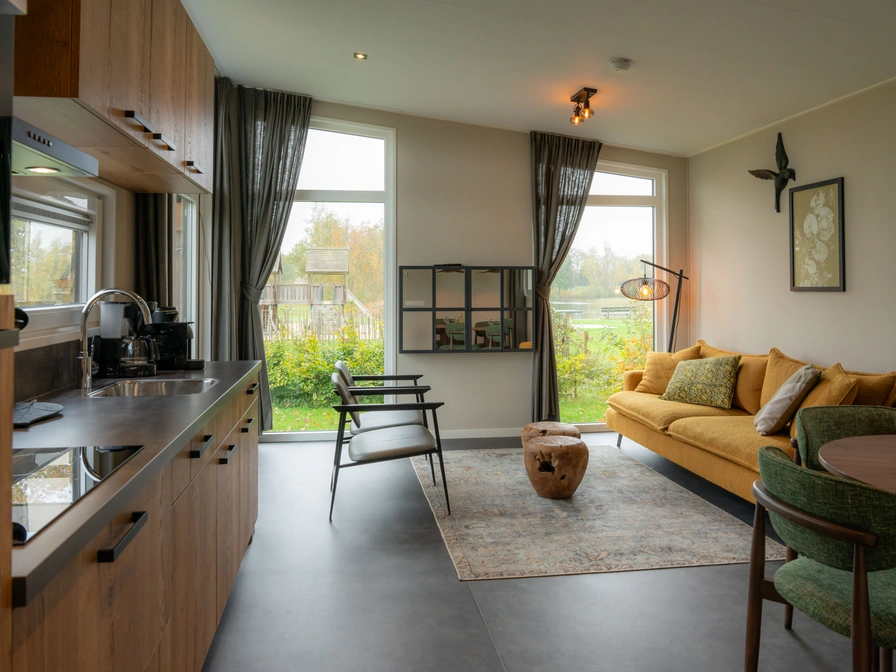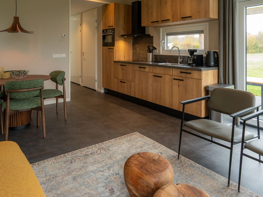 This luxury holiday home is situated in a central location, surrounded by both water and forest, making it the ideal place for a peaceful holiday. With space for 4 people, this extremely luxurious holiday home is entirely on one level, making it especially suitable for seniors and families, and of course for you too. Holiday home Yn 't Bosk has a luxurious and modern appearance and is sheltered at the edge of the forest. Here you can enjoy nature to the fullest. This charming holiday home features a modern, luxurious eat-in kitchen and a relaxed seating area. The kitchen is equipped with a dishwasher, a Nespresso coffee machine, and a refrigerator with a freezer compartment. Yn 't Bosk features 2 bedrooms with comfortable box-spring beds. If you need a cot, one can be added in the living room. Additionally, you will find a bathroom with a shower and toilet, and an extra separate toilet for added convenience.
