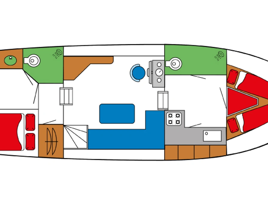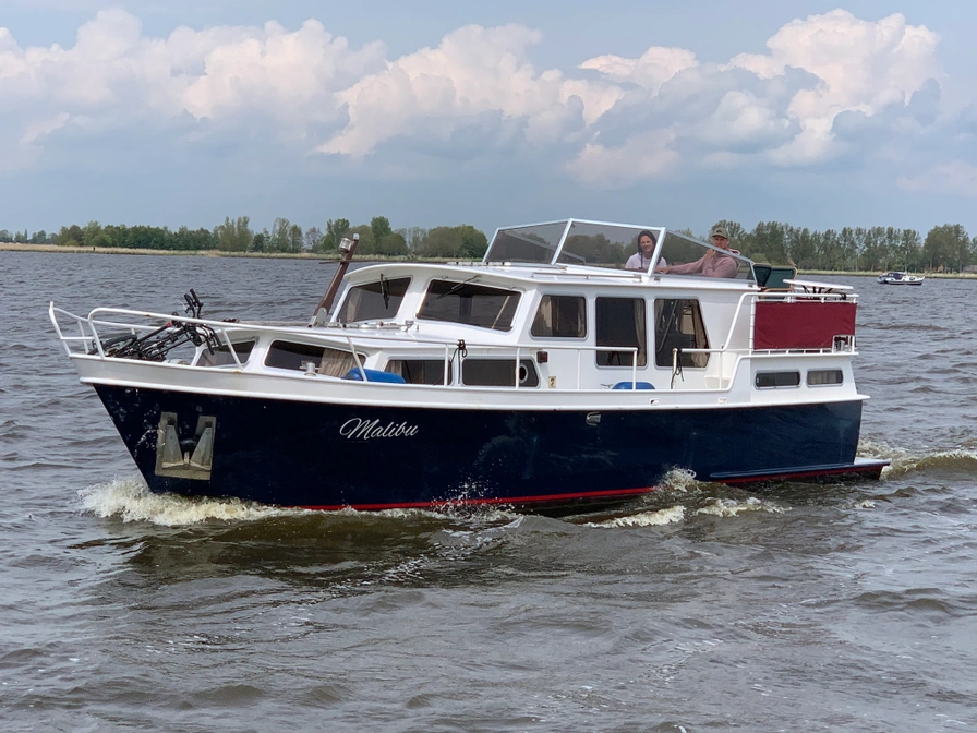 The Pikmeer 1100 Malibu boasts a homely interior with a sitting area and a practical galley. There are two cabins, each with its own shower and toilet, ensuring privacy. Inside, there's a saloon with an indoor steering position, and outside, a spacious aft deck with an outdoor steering position, seating four. Thanks to heating, a refrigerator with freezer compartment, and a stove, you're completely self-sufficient and ready for a relaxing boating holiday in Friesland.