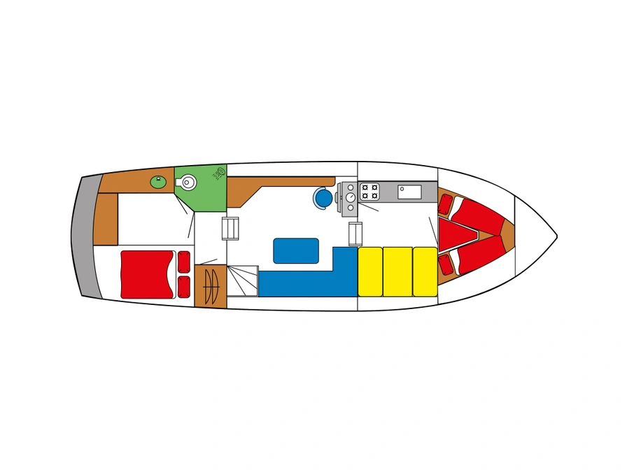 The Pikmeer 1100 Jamaica is spacious and practically laid out, with two comfortable seating areas and a well-equipped galley. There are two cabins, a shower, and a toilet, providing ample privacy. Inside, you'll find a helm station in the saloon, while the spacious aft deck with an outdoor steering wheel is the perfect place for six to relax and enjoy the view. Thanks to heating, a refrigerator with freezer compartment, and a stove, you can comfortably spend the night in both marinas and the heart of Frisian nature.