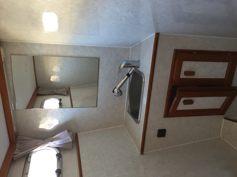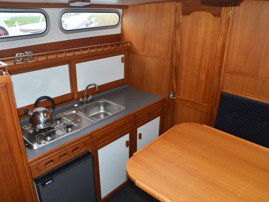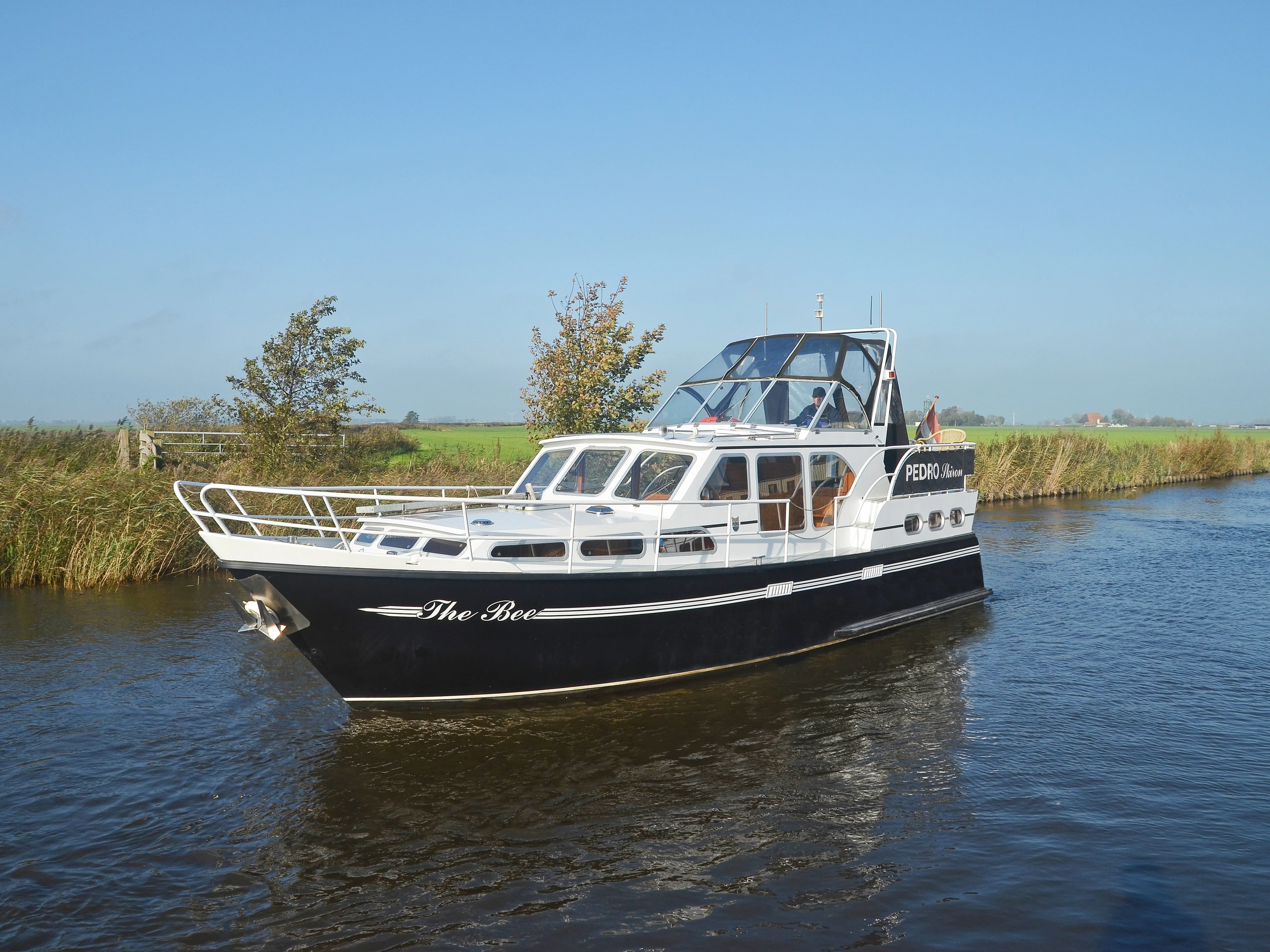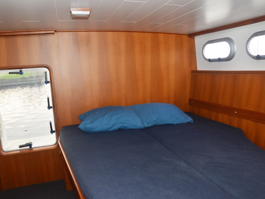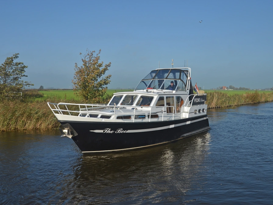 The Pedro Skiron The Bee is a spacious and comfortable cruiser with two lockable sleeping cabins, a shower, and a toilet. The saloon features a comfortable lounge sofa and ample seating. The galley is fully equipped with a refrigerator and freezer, ensuring you're always comfortable while underway. Outside, The Bee boasts a spacious aft deck with a convertible tent, ideal for comfortably seating six people. The generous swimming platform completes the boat and offers added convenience for swimming or mooring. Thanks to the indoor and outdoor steering position and bow thruster, this cruiser is easy to handle and perfect for a relaxing holiday in Friesland.