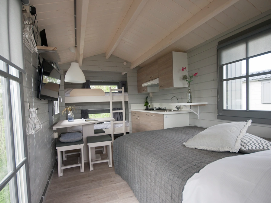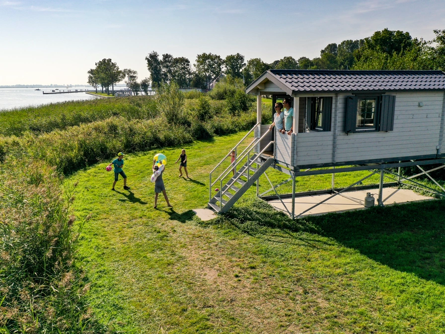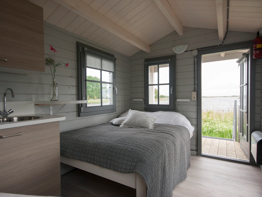 This beautiful and cozy camping chalet on Lake Sneekermeer is elevated on 1.5-meter-high stilts. Despite its compact size, it offers complete accommodation for four people. Each camping chalet is equipped with a small kitchenette, a double bed, a bunk bed, and a veranda where you can enjoy the weather and the view of Lake Sneekermeer. Toilets and showers are not available in the camping chalet; you can use the restrooms in the building. To book the chalet, please contact the owner directly.