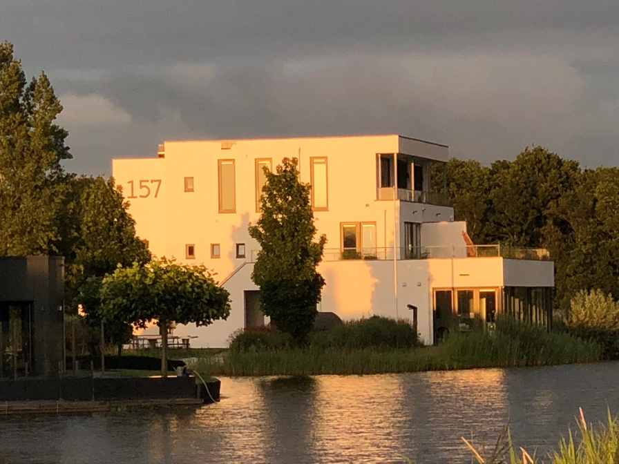 This beautifully decorated Ibiza style villa consists of no fewer than three spacious floors (with a total of 1000 m2 of floor space) and is located on its own peninsula, with a private beach and a large garden. On the ground floor you will find five bedrooms, styled according to the theme of Dutch masters and a total of 9 sleeping places. In one of the bedrooms you will find an electric senior bed. There is also an office/workshop space on the ground floor with large work tables and office chairs, a bathroom with washing machine and dryer, two separate toilets, a breakfast kitchen and a large living room with game room/home cinema/silent disco. On the middle floor there is a living room, two separate toilets, a kitchen, a piano or music room, a bar with wine wall and beer tap and a laundry room, including washing machine and dryer. One of these two toilets is a Geberit shower toilet. And on the third floor there are four bedrooms, a separate toilet and wellness facilities. There is a spa with sauna, duo shower, Turkish steam bath, jacuzzi and sunbed. You can also exercise on this floor. The villa has its own beach, no fewer than 4 terraces (with several BBQs + outdoor oven and outdoor kitchen), a vegetable garden, a large garden with table tennis table, a floating terrace, a fishing and swimming pond, and 11 private parking spaces. Do you have an electric car? You can charge it here because we have our own charging station.