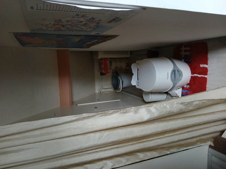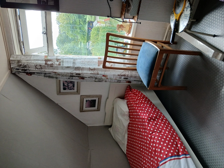 In this house you have your own floor which can be reached via a good fixed staircase. This allows you to use two bedrooms and a cozy sitting area with radio and TV. One of the bedrooms has a double bed and the other bedroom has a single bed. On the floor there is also a chemical toilet and a sink with hot and cold water. You can shower on the ground floor in the shared bathroom. The cozy garden includes a number of seating areas where you can enjoy yourself in nice weather, for example under the pear tree. From the rooms on the first floor you can enjoy a beautiful view of the fields all around. There is a garden terrace where the owner sells coffee/tea, cakes and ice creams.
