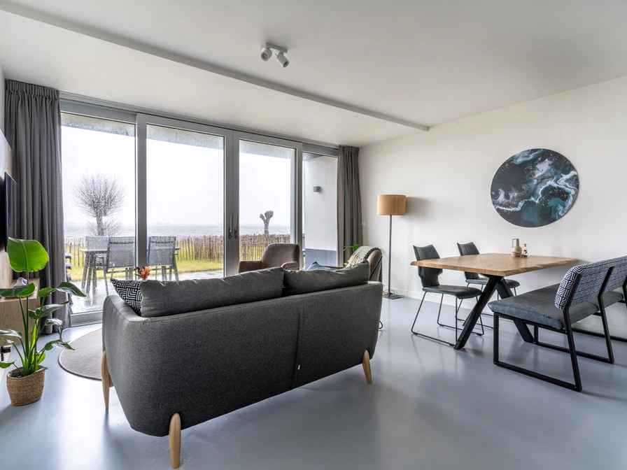 This apartment has no fewer than two terraces! At the front is a terrace, just like at the rear. The terrace at the front has evening sun, making it a good place to relax at the end of the day. The terrace with garden at the rear borders on the Sneekermeer, so you can enjoy a beautiful view. The apartment is equipped for four people and has two bedrooms, each with two single box-spring beds. There is also a spacious bathroom with shower, toilet and sink. The living room is spacious with a nice sofa and chairs overlooking the Sneekermeer and a cozy dining area. From the living room you can easily step into the garden. The kitchen is fully equipped including a refrigerator, dishwasher and combi oven.
