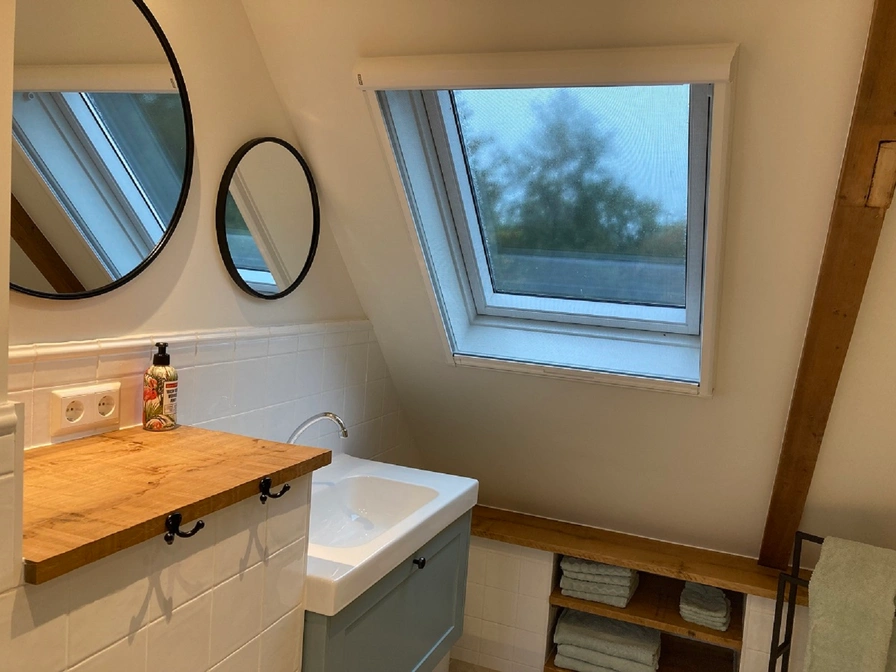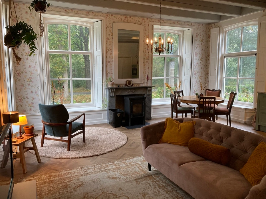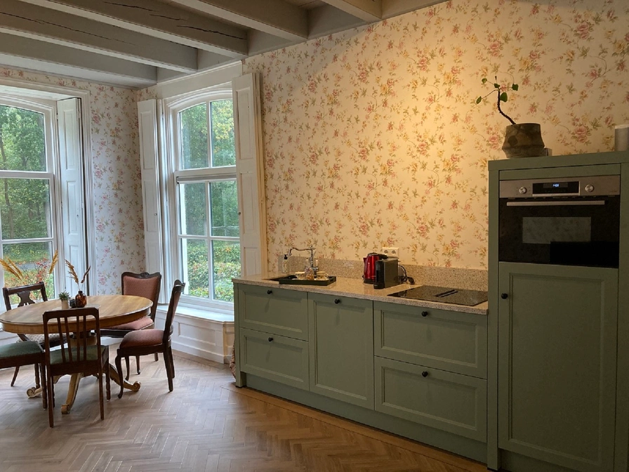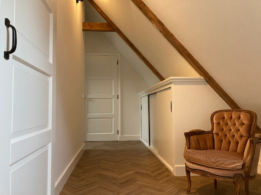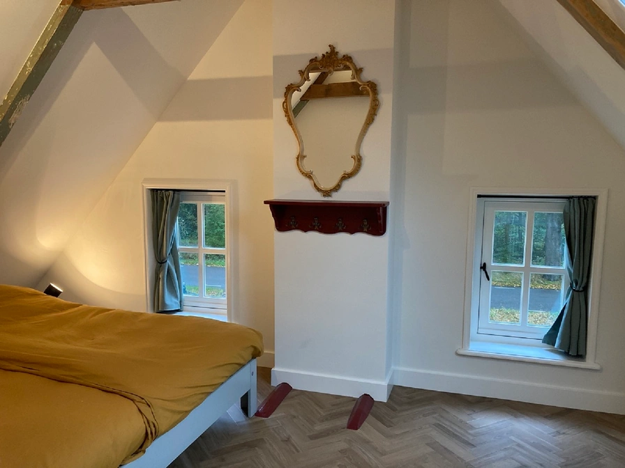The front house of this stately head-neck-rump farm from 1875 can be rented as a B&B or holiday home. The front house was renovated in 2022, the original details have been preserved and restored. The beautiful windows, the authentic carpentry and the box bed make this house unique. The upstairs room has a fully equipped kitchen including a dishwasher and refrigerator with freezer. In the upstairs room you can dine at the round table, you can sit comfortably around the fireplace and it is also possible to watch a nice movie on the television. On the first floor there are two bedrooms, a spacious hall with ample cupboard space and a luxurious bathroom with a nice shower and toilet. Outside are beautiful places to enjoy the sun, the birds and the silence. Coffee and tea are of course available.