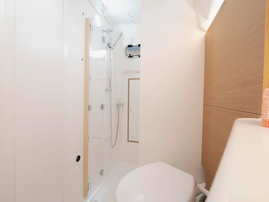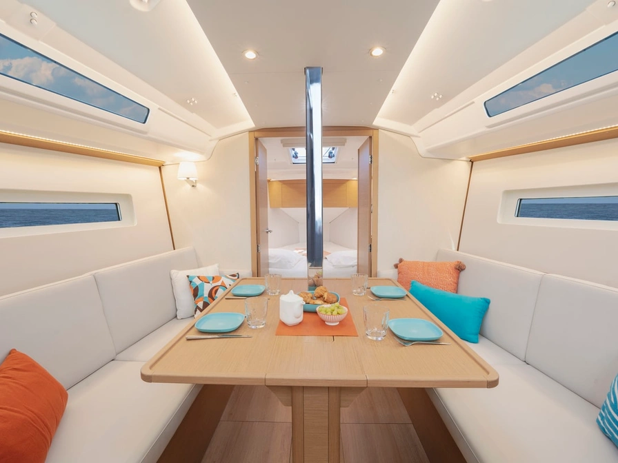The Jeanneau Sun Odyssey 350 is available for charter from 2025. Thanks to its hydraulic lifting keel, you can sail on the Frisian lakes, as well as the IJsselmeer and the Wadden Sea. Inside, there are three cabins with six fixed berths, and the saloon can accommodate two additional berths. The galley is fully equipped, and there's an electric toilet with a shower and hot water. Heating and 12V and 230V electricity make for a comfortable stay. Outside, you'll enjoy a well-organized cockpit and dual steering wheels. All lines are controlled from the cockpit. The swimming platform is ideal for a swim stop. A bow thruster and electric windlass make mooring easy.