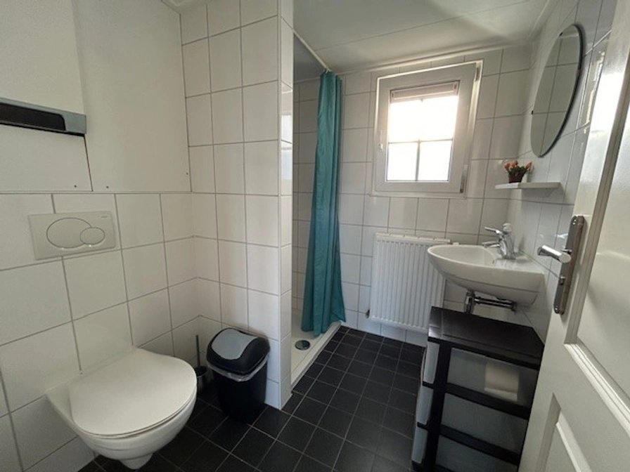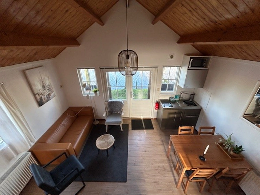 This tiny house has an open living room with dining area and kitchenette. There is a comfortable bathroom with shower, toilet and sink. there are two bedrooms in the tiny house. The first is a ground floor bedroom with a double bed. The second bedroom is a loft off the living room. This room cannot be closed. Through the French doors you enter the veranda with terrace and you have a beautiful view of the countryside.
