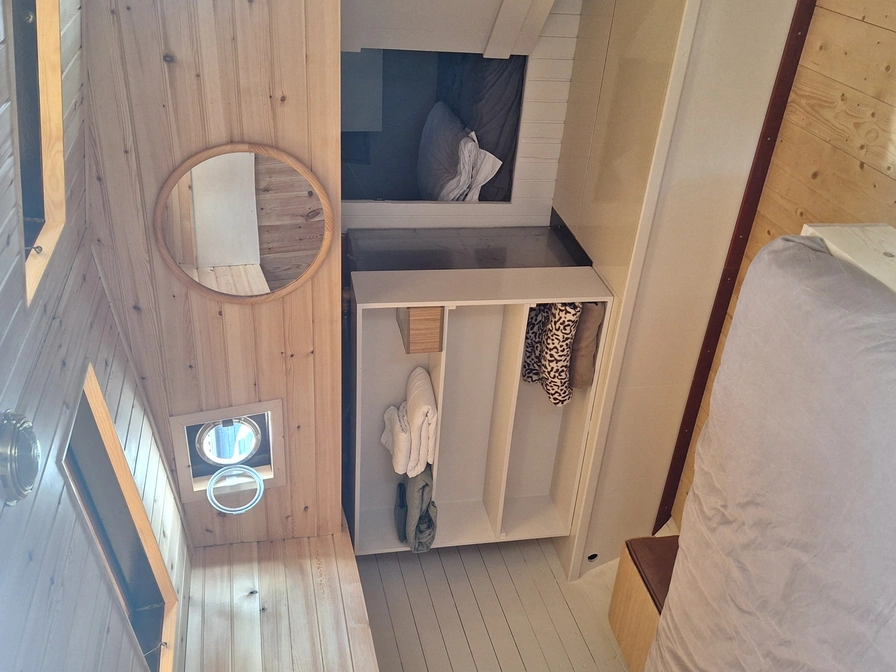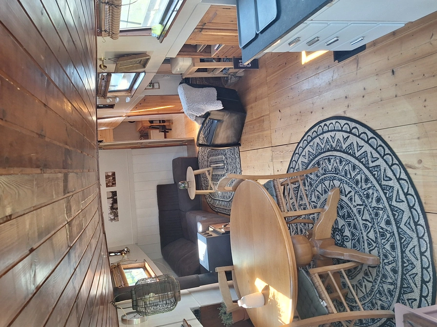 When you walk in there is an open living space with a kitchen, dining area and a sitting area with television. If you continue in the boat you will arrive at the sleeping areas. The sleeping area will be raised as of July '24, creating headroom. There is a bedroom with two single beds and a double bed. On board you have a small electric toilet, and you also use the port sanitary facilities (toilet & shower). On the deck there are 4 chairs, a side table and there are 2 bicycles on board that you can use.