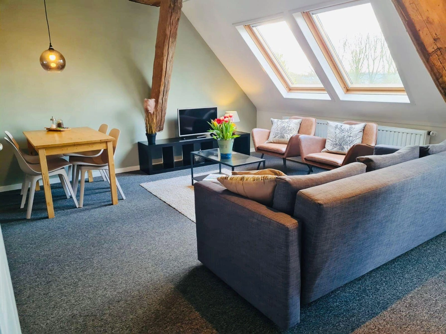 Directly under the roof trusses, located on the second floor, you will find these studio/apartments suitable for 2-4 people. The studio has a spacious, attractively furnished living room with open kitchen and a comfortable bathroom with shower and toilet. There are two comfortable beds and a double sofa bed. The kitchen is equipped with all necessary built-in appliances such as a dishwasher, combination microwave, refrigerator with freezer, induction hob, etc. There is a television and free WiFi available.