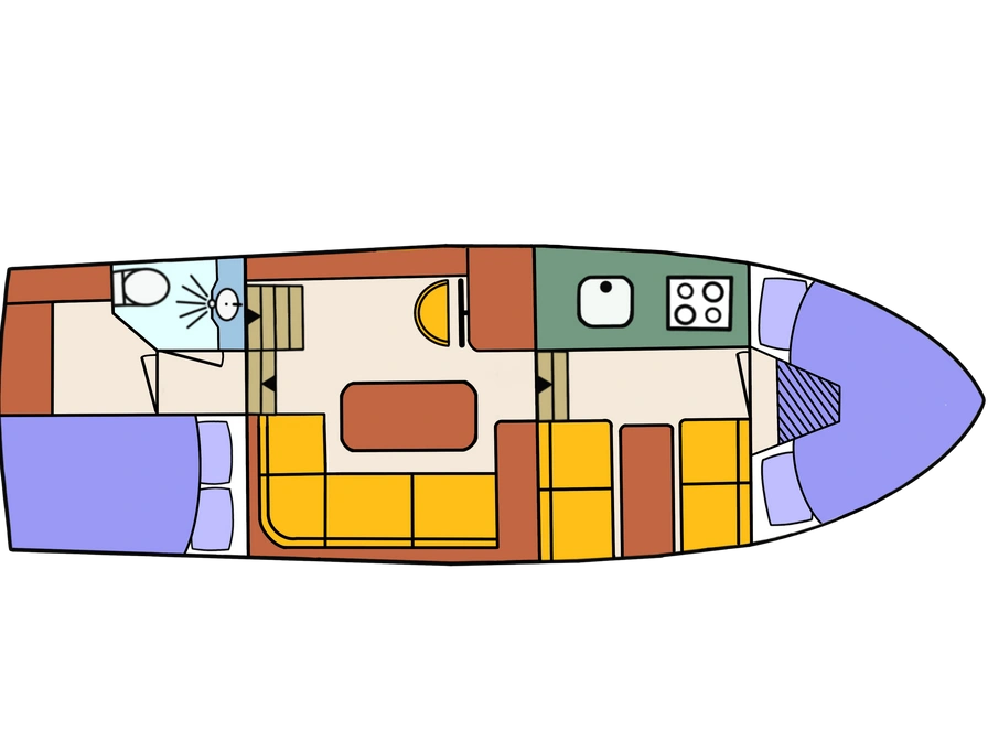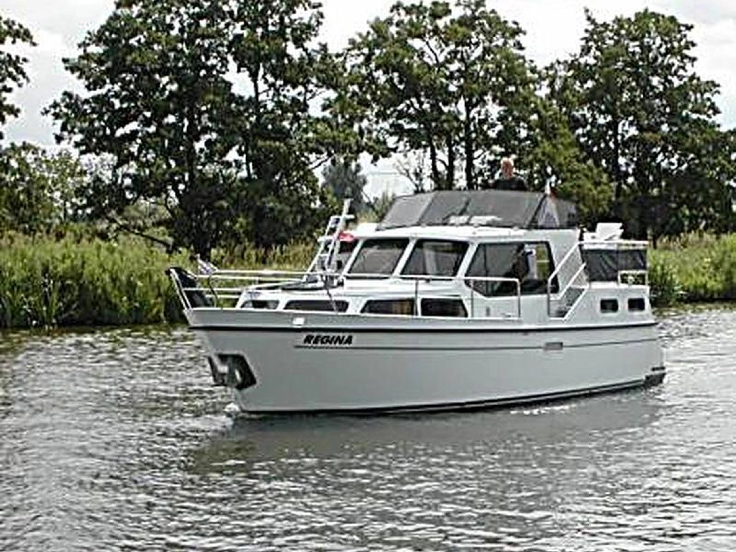 The Regina is a spacious motor yacht for 4 to 6 people. Inside, you'll find a separate bedroom with a double bed, a bedroom with two single beds, and a convertible dinette. The saloon is bright and comfortable, with a fully equipped galley, separate shower, and electric toilet. Outside, there's a lovely aft deck with seating and a helm station, perfect for enjoying the view and fresh air.