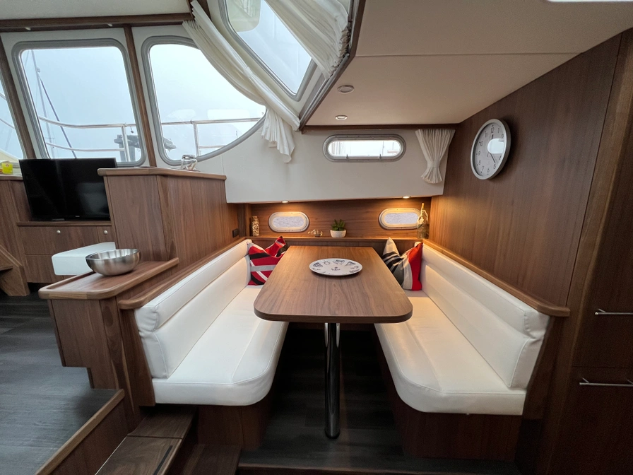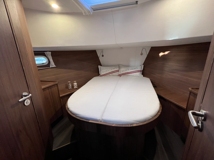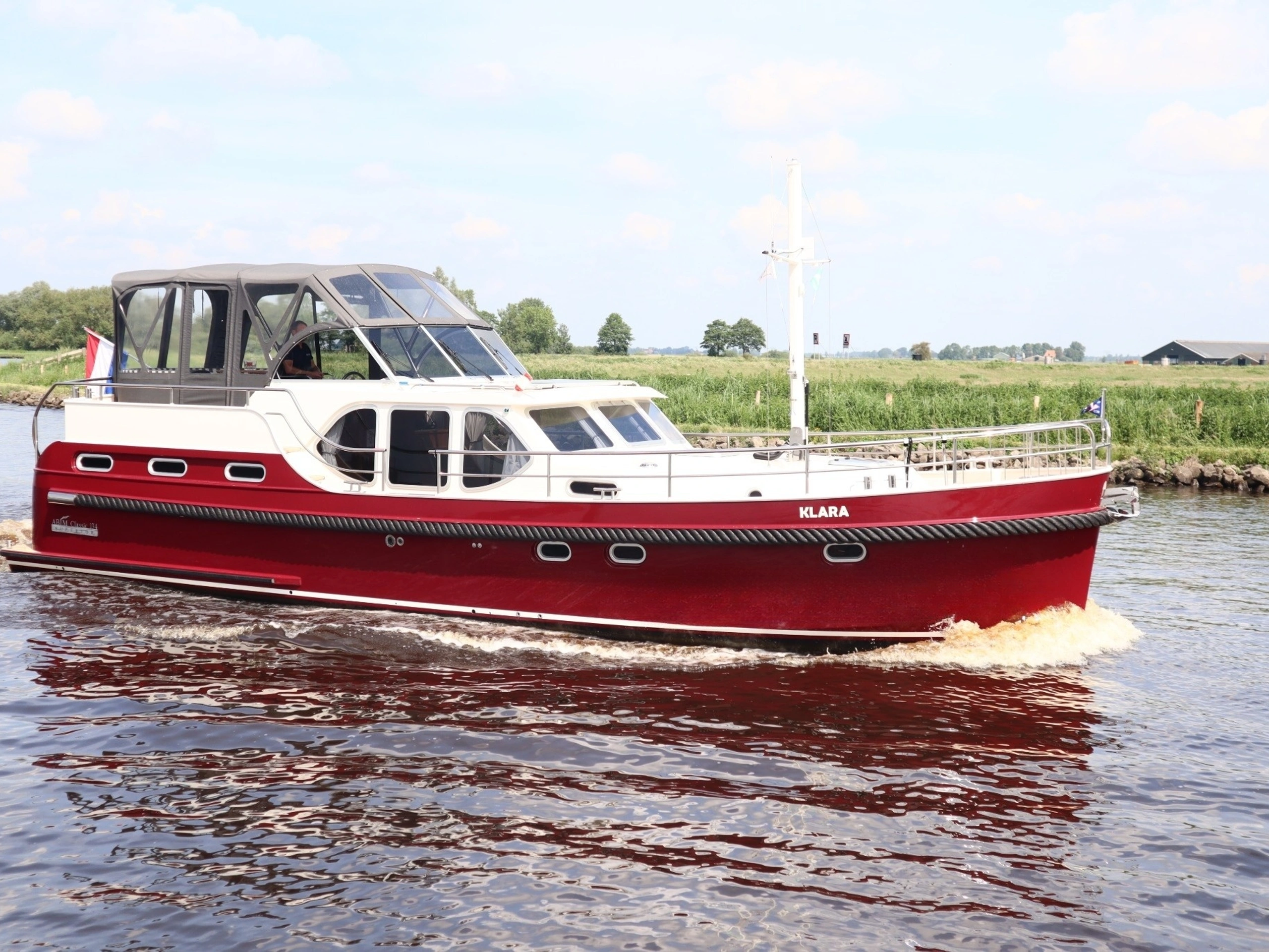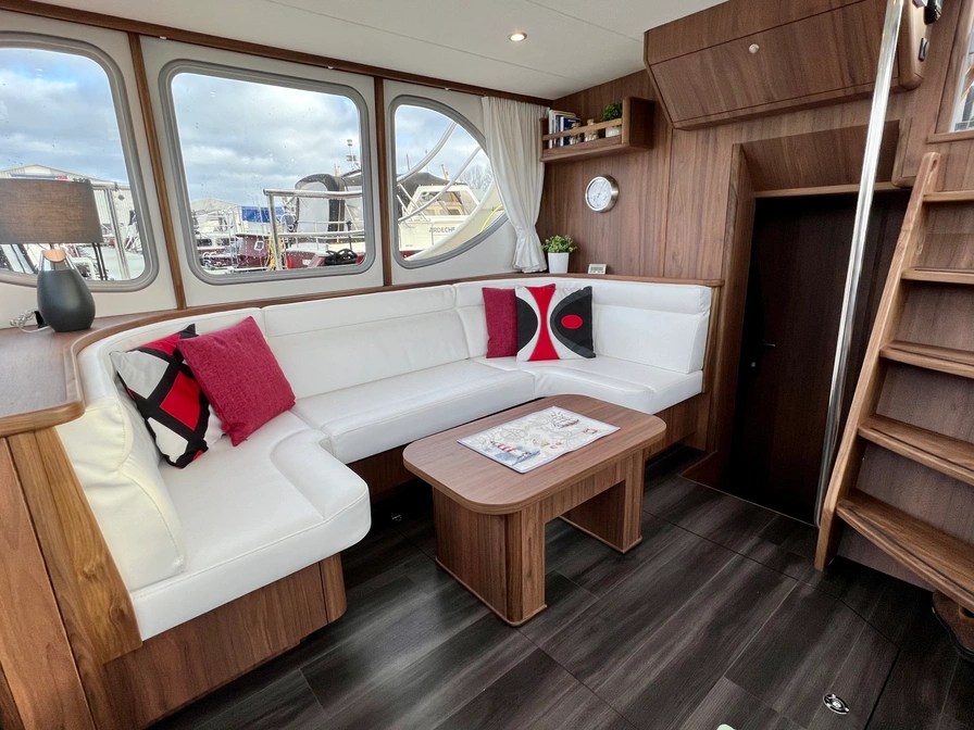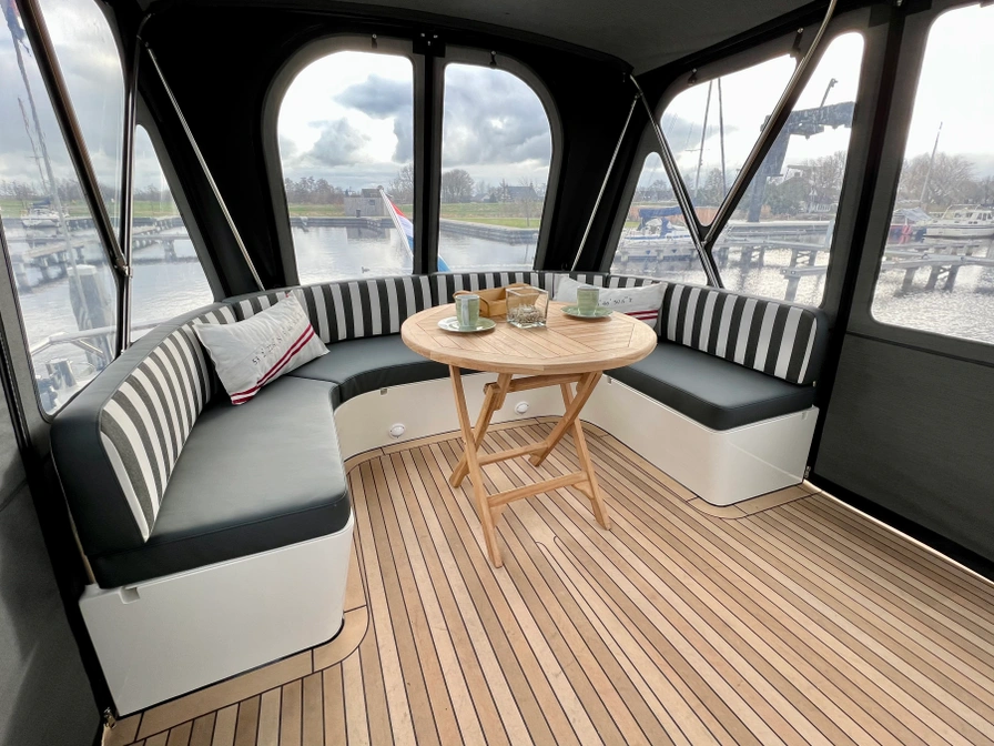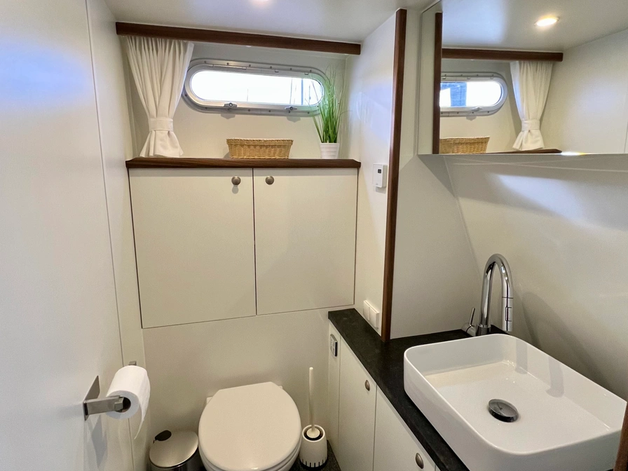 Dit motorjacht uit 2023 combineert een karakteristieke scheepsvorm met modern comfort en luxe voor 4 personen. Dankzij de bijlsteven is de waterlijn verlengd, wat niet alleen de vaareigenschappen verbetert, maar ook zorgt voor ca. 5 m³ extra binnenruimte ten opzichte van een schip met een traditionele boeg. Indeling: Achterin vind je een royale master bedroom met een eigen douche, apart toilet en een handige was-/droogcombinatie. Voorin bevindt zich een tweede comfortabele hut met tweepersoonsbed, eveneens voorzien van een aparte douche en toilet. De sfeervolle salon met U-vormige zithoek, televisie en radio biedt volop zitcomfort. De ruime, moderne keuken is volledig ingericht voor 4 personen en beschikt over een inductiekookplaat met afzuigkap, grote koelkast met twee vriesvakken, vaatwasser, combimagnetron, koffiezetapparaat en waterkoker. De salon is voorzien van dubbele beglazing en het hele schip beschikt over vloerverwarming – comfortabel in elk seizoen. Buiten geniet je op het achterdek van een vaste U-bank met opbergruimte voor twee vouwfietsen, verwarming, een XL-cabriotent, windscherm, stuurstand met GPS-kaartplotter en een zonnepaneel voor extra stroomonafhankelijkheid. Via een led-verlichte trap bereik je het zwemplateau met opklapbare zwemtrap. Achterdek, gangboorden en zwemplateau zijn stijlvol afgewerkt met Permateak. Kortom: een bijzonder compleet schip voor wie comfort en luxe op het water belangrijk vindt. Let op: heb je geen vaarervaring? Dan is een vaarinstructie verplicht.