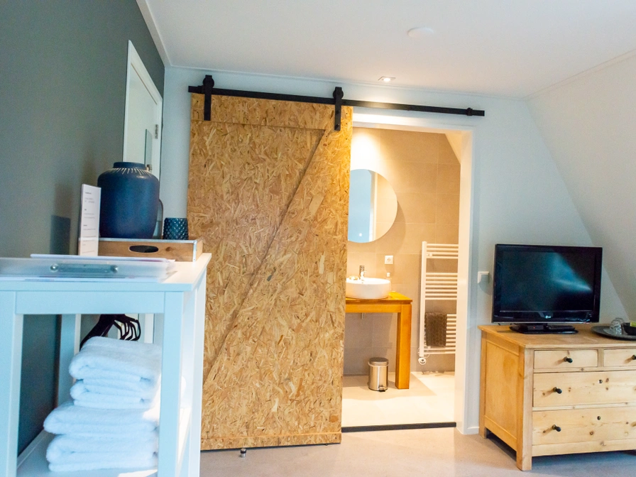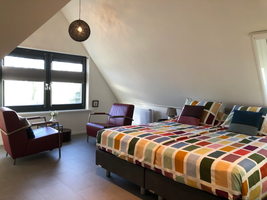 Deze kamer heet 'Loft', het Friese woord voor lucht. In de kamer staan twee comfortabele eenpersoons boxspringbedden, perfect voor jouw nachtrust. Tevens is er een knus zitje en televisie in de kamer. In de privé badkamer vind je naast een douche, toilet en wastafel ook verschillende verzorgingsproducten, een föhn en handdoeken. Mocht je een kopje koffie of thee willen zetten, dan kun je dit doen op de overloop waar de pantry is. Hier kun je eventueel ook een drankje (tegen betaling) uit de koelkast pakken. Iedere ochtend wordt het ontbijt geserveerd in de stijlvolle eetkamer, dit ontbijt bestaat uit lokale producten én huisgemaakte lekkernijen van oogst uit de eigen tuin!