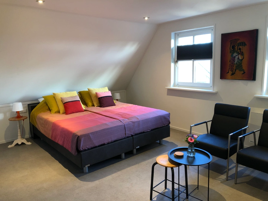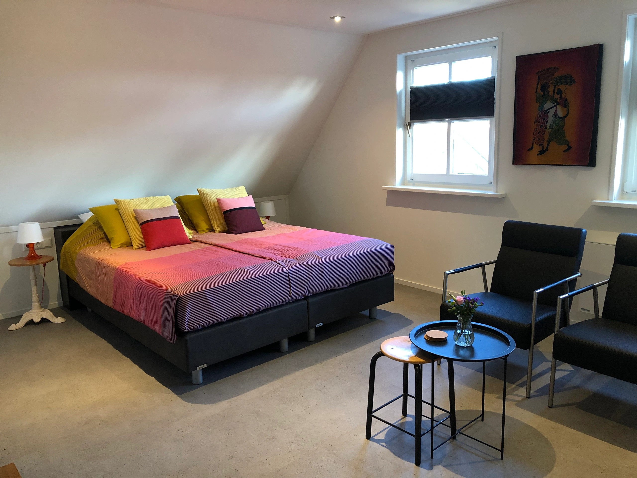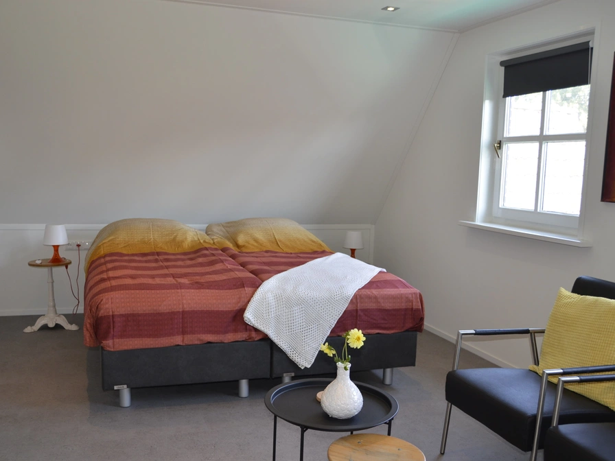Deze zonnige kamer heet 'Sinne', het Friese woord voor zon. Je hebt een eigen kamer met luxe boxspringbedden en een gezellig zitje met televisie. De badkamer is goed uitgerust met een inloopdouche, toilet en wastafel. Daarnaast vind je hier ook een föhn, diverse handdoeken en verzorgingsproducten! Op de overloop van de b&b is een pantry gerealiseerd, hier kun je zelf een kopje koffie of thee zetten, maar ook een drankje uit de koelkast nemen. Het ontbijt wordt iedere ochtend geserveerd in de eetkamer en bestaat uit regionale producten en huisgemaakte lekkernijen geoogst uit eigen tuin!