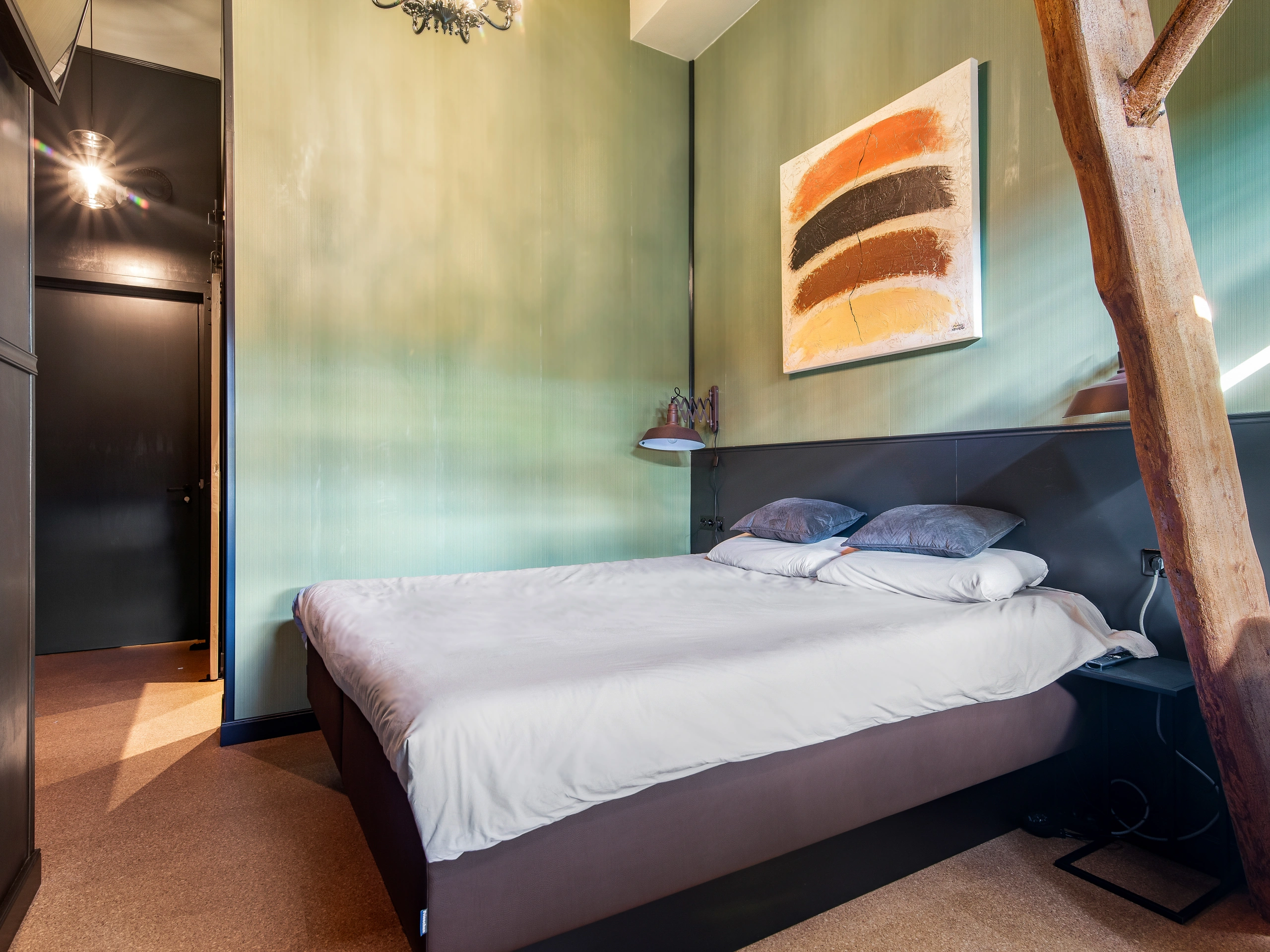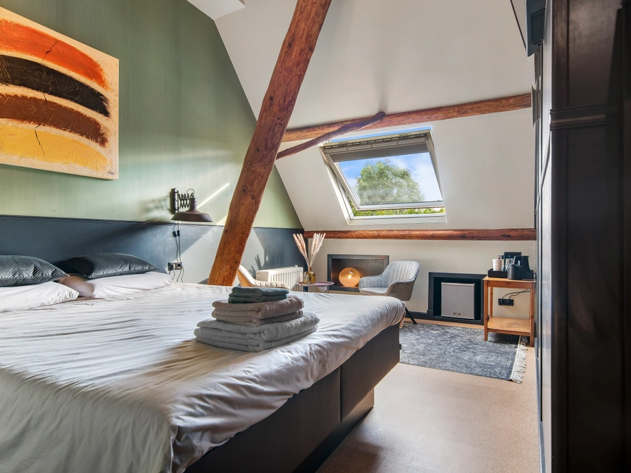 Deze fijne kamer met houten panelen als wandbekleding is gesitueerd op de eerste verdieping. Het bed is een luxe maximaal gestabiliseerd waterbed (180x210). De oude kenmerken van de boerderij zijn nog zichtbaar door de balken. Je kunt een eigen kopje koffie of thee zetten en er staat een klein koelkastje in de kamer. De comfortabele badkamer beschikt over een douche, toilet en wastafel. Voor het reserveren van een kamer in deze B&B dien je rechtstreeks contact op te nemen met de eigenaresse.
