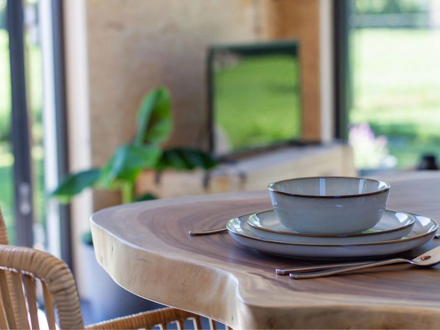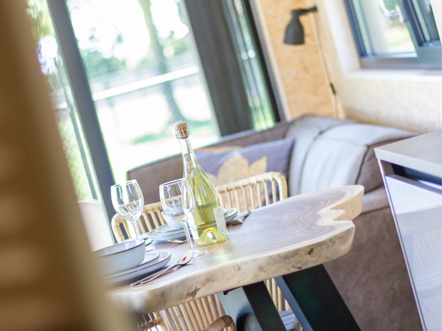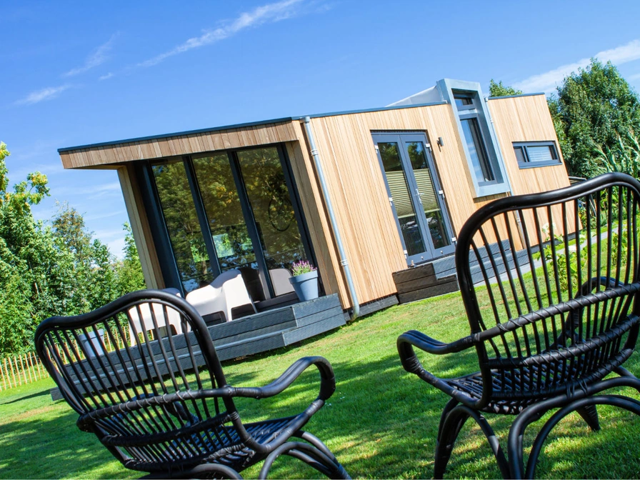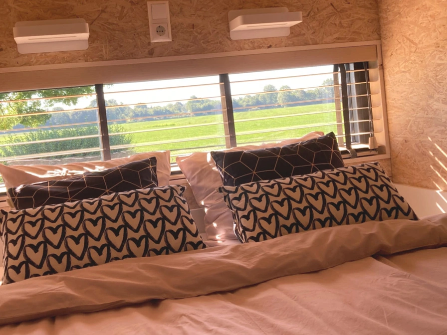 Tiny House Oblique is geschikt voor twee personen. Je vindt er een tweepersoonsbed, badkamer met douche en een volledig uitgeruste keuken met vaatwasser. De openslaande tuindeuren leiden naar een privé tuin met een loungebank, verhoogd terras en een vuurplaats met BBQ.