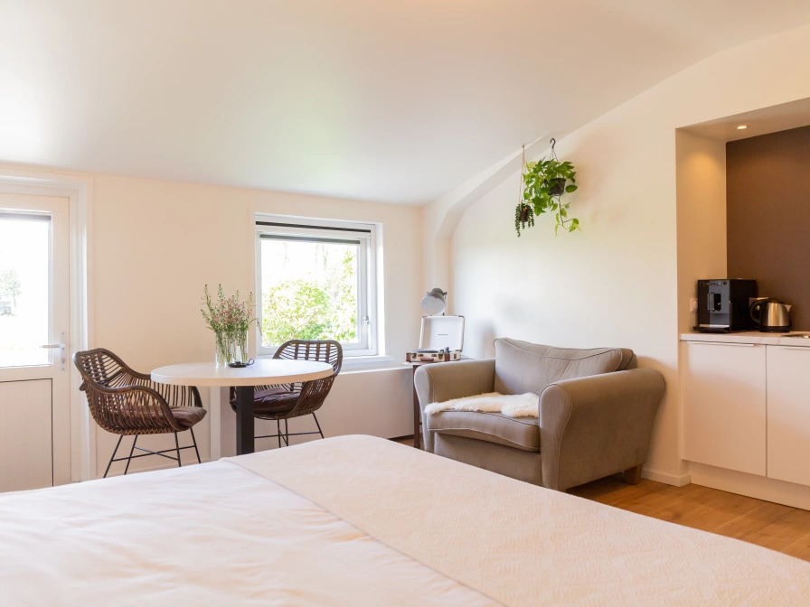Sfeervolle en compleet ingerichte studio met directe toegang tot je eigen terras. Het appartementje beschikt over een kingsize bed, eethoek, loveseat, inloopkastje en een moderne keuken voorzien van koelkast, oven, tweepits kookplaat, koffiemachine en waterkoker. De fijne en-suite badkamer is voorzien van een wastafel, inloopdouche en toilet. Alleen de televisie ontbreekt, speciaal voor mensen die liever een boek lezen of een LP afspelen in de vakantie. Op je privéterras kun je genieten van fantastische zonsondergangen! Voor het reserveren van deze accommodatie dien je rechtsreeks met de verhuurder contact op te nemen.