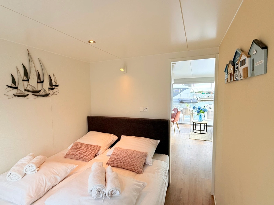 Dit Boothuisje is praktisch en comfortabel ingericht. Het is een compacte hotelkamerboot welke is voorzien van een goede airconditioning. Binnen vind je een open leefruimte met SmartTV, een zithoek met keukentje. Er is een aparte slaapruimte met een ruim tweepersoons bed en er is een extra kamer met een stapelbed. De badkamer beschikt over een douche en toilet. Buiten heb je een eigen terras op zowel het voordek als op het dakterras. Zo kun je heerlijk uitkijken over alles wat er in de huisboothaven en op het Sneekermeer gebeurt. Verrassend en levendig!