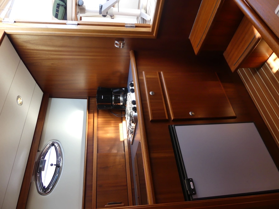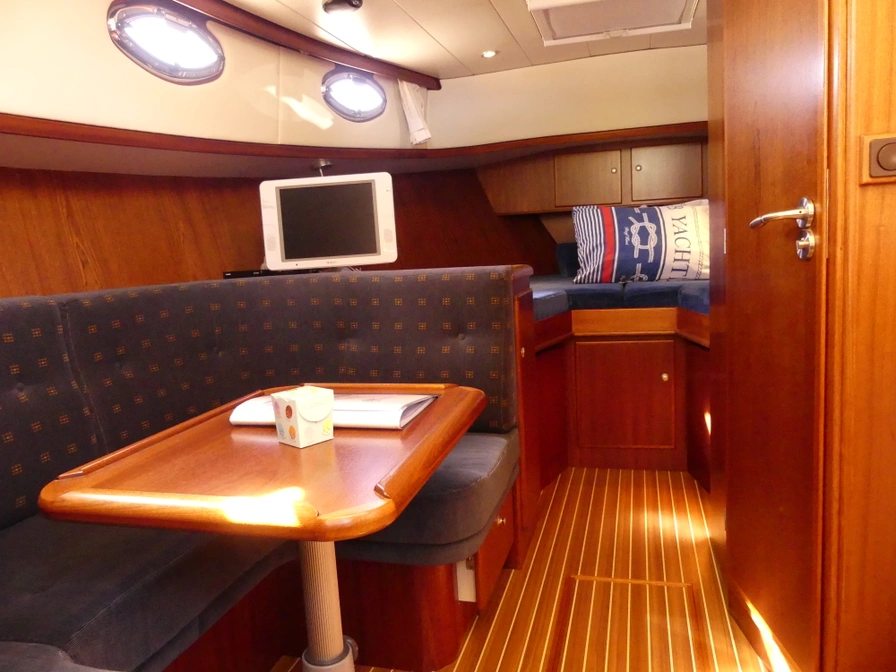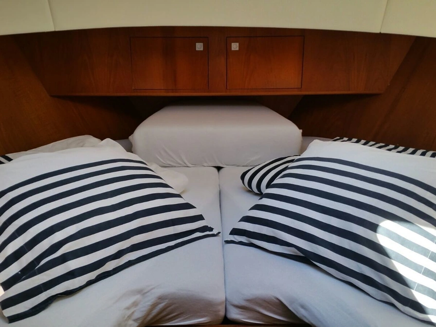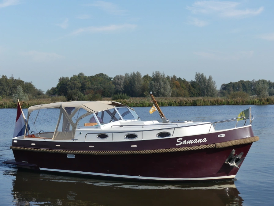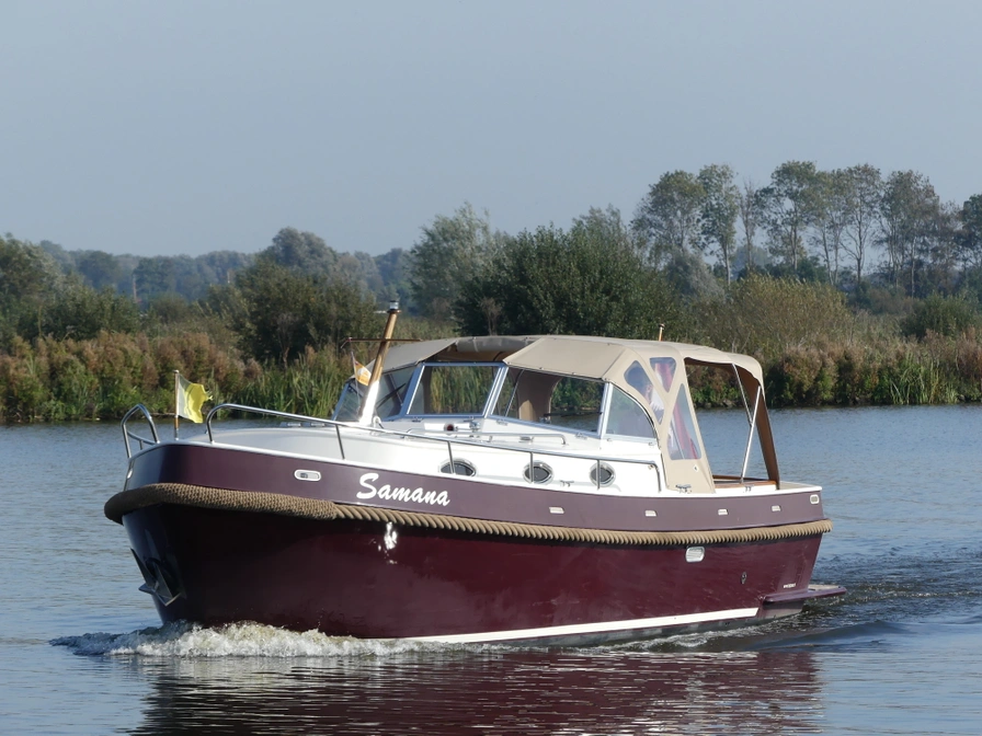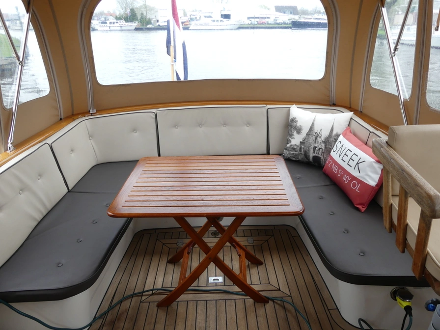 Uniek aan deze boot is de grote open kuip met 2 stuurstoelen, gezellige rondzit en luxe cabriotent. Het zwemplateau met zwemtrap en de douche met warm en koud water. De kuip is voorzien van heteluchtverwarming en LED-verlichting zodat je ook met minder mooi weer kunt blijven doorvaren en genieten. De kuip is zelflozend, heeft veel opbergruimte en walstroomaansluiting. Interieur: Kajuit 1.90 m. Stahoogte. Royaal 2-persoonsbed in de punt met luxe matrassen en lattenbodem (2.40 x 2.20 mtr.). Er is een ruime zithoek, veel kastruimte. Heteluchtverwarming, inbouwspots met dimmer, leeslampjes. LCD-TV met Digitenne, DVD-speler en aansluiting SD-kaartje, Radio/CD. De keuken met compleet inventaris is geschikt voor 4 personen, koelkast (85 liter), 3-pits kooktoestel, waterkoker en koffiezetapparaat, boiler voor warm water, watertank 170 liter. Luxe sanitaire ruimte met elektrisch toilet, wasbak en handdouche. Spoelwater wordt opgevangen in vuilwatertank. Victron omvormer 220 V, zodat je ook tijdens het varen van stroom bent voorzien. Beddengoed dien je zelf mee te nemen of bij ons te huren. Hoofdkussens zijn aan boord. Kaartplotter, Frieslandkaart en de mooiste vaarroutes zijn aan boord.