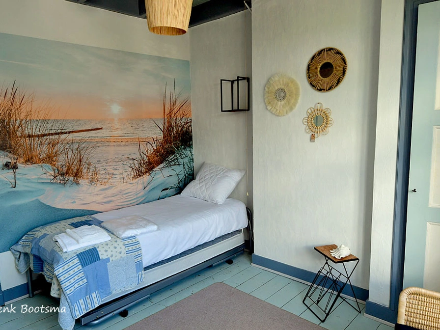 Kamer Gast is een knusse eenpersoonskamer met een strand- en zeethema. De kamer is praktisch ingedeeld met een comfortabel bed, een kleine zitplek en voldoende opbergruimte.