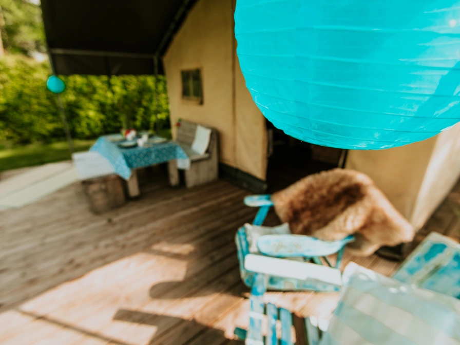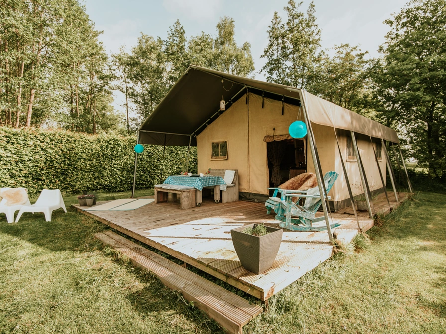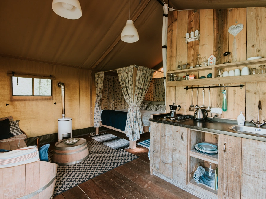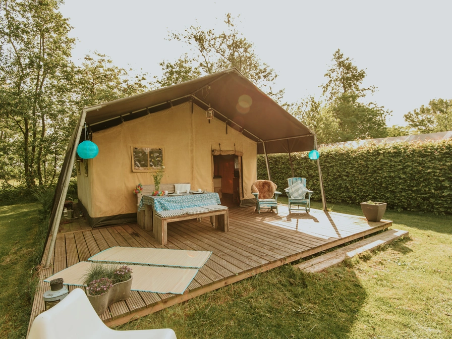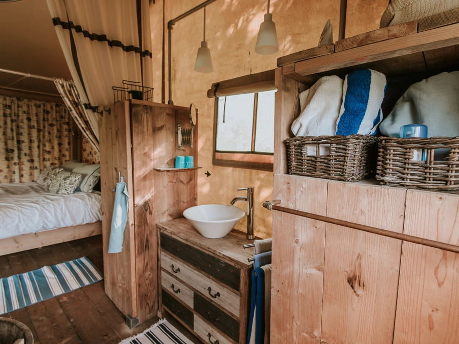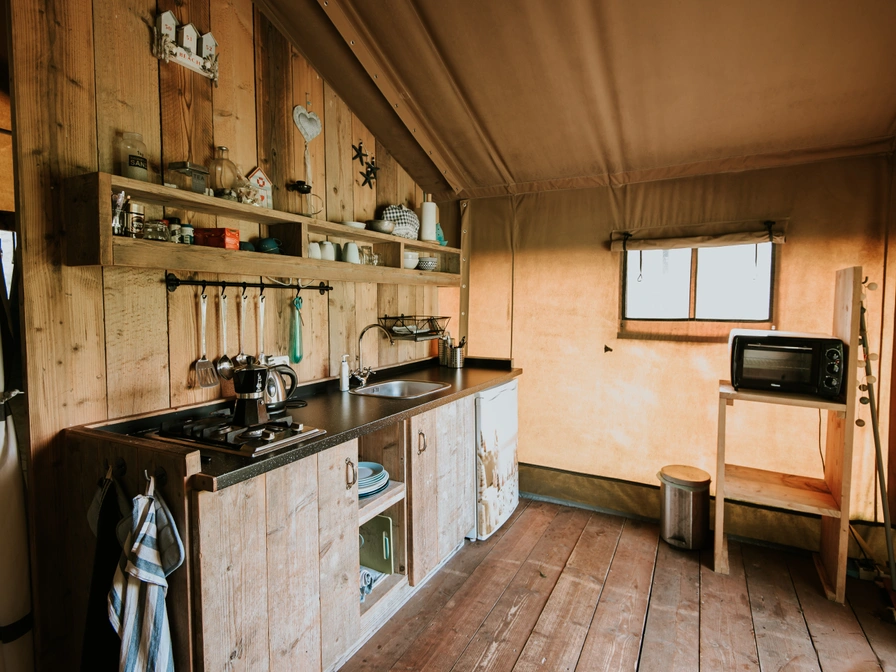 'On the Beach' is een prachtige tweepersoons safaritent. De tent is zo ingericht dat je helemaal in de sfeer raakt van het strand. Het voelt echt alsof je in een strandhuisje verblijft. On the Beach is voorzien van een tweepersoons hemelbed, een goede regendouche, apart toilet en een compleet ingerichte keuken. Als de avond fris is, kun je desnoods het warme gaskacheltje aanzetten. Er is ook een mooie veranda bij de tent waar je heerlijk van de zon kunt genieten en kunt dineren samen.