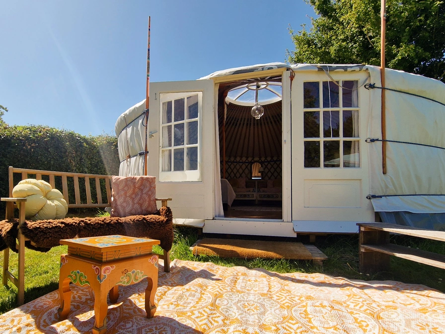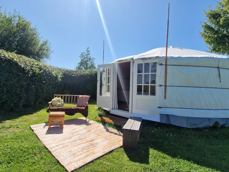 Buiten staat een picknicktafel waar je kunt eten. Bij goed weer kun je ook een vuurtje maken. De yurt staat aan de rand van de kleinschalige camping waardoor je veel privacy hebt.